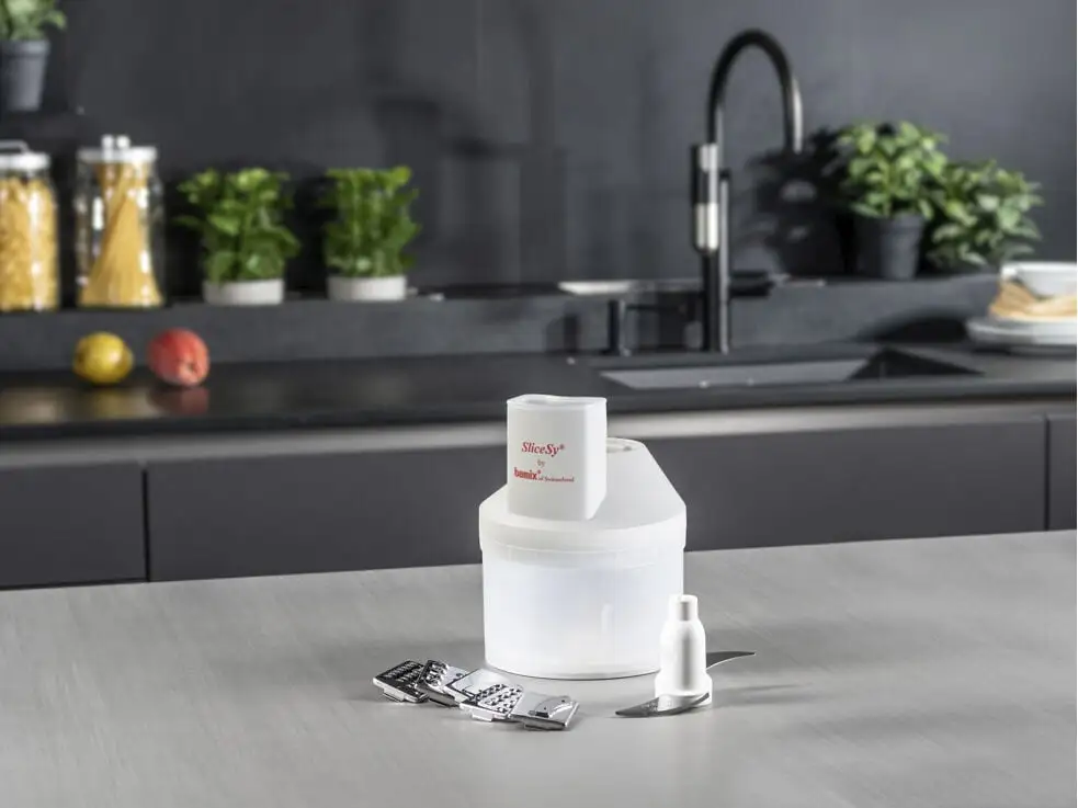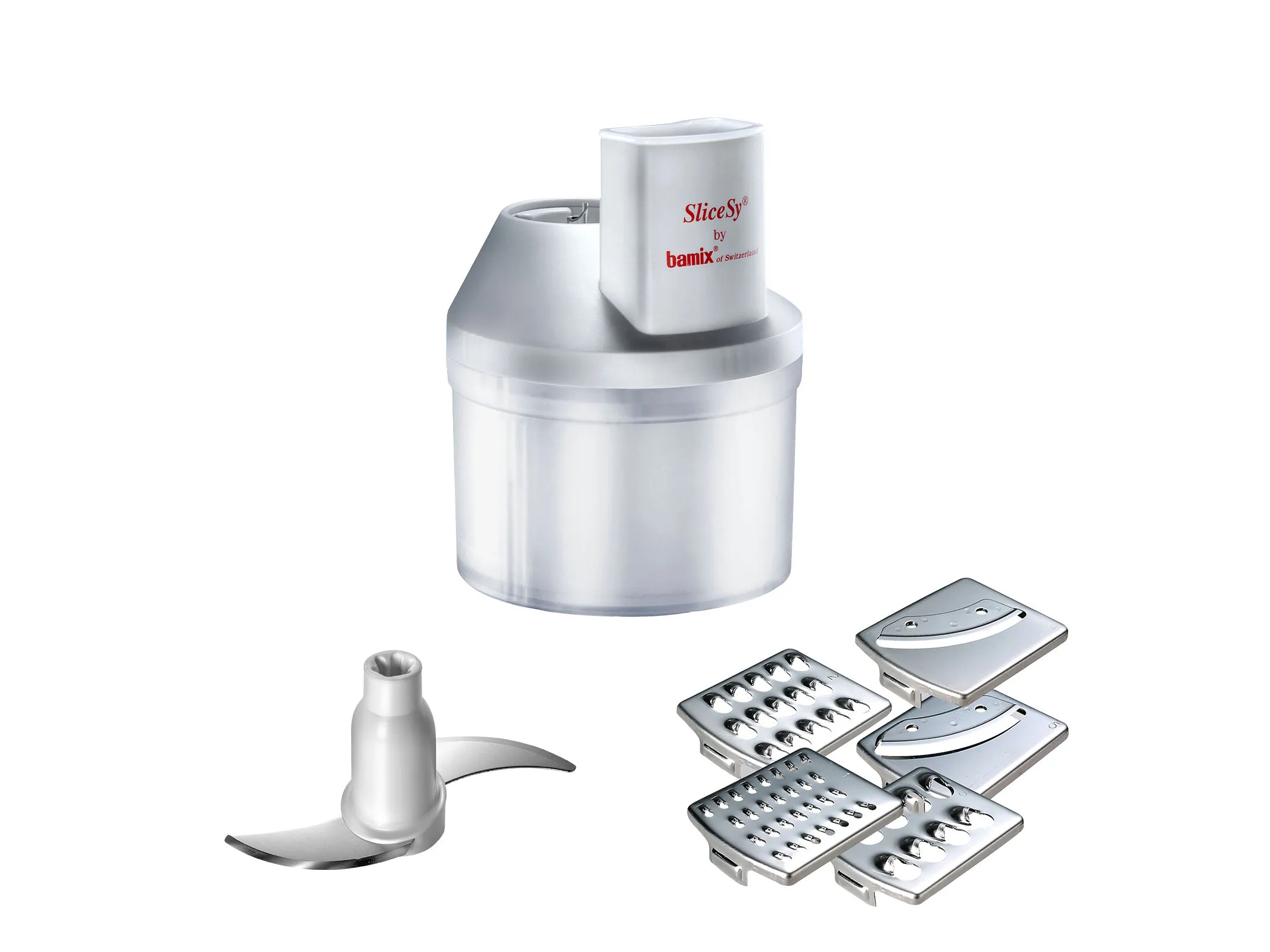 bamix®-tilbehør. SliceSy® til at hakke, rive, snitte og kværne – det hele klaret på den halve tid. Kan også bruges til at røre og blande dej. Produktet har en kapacitet på ca. 6 dl og leveres med 5 knivblade.