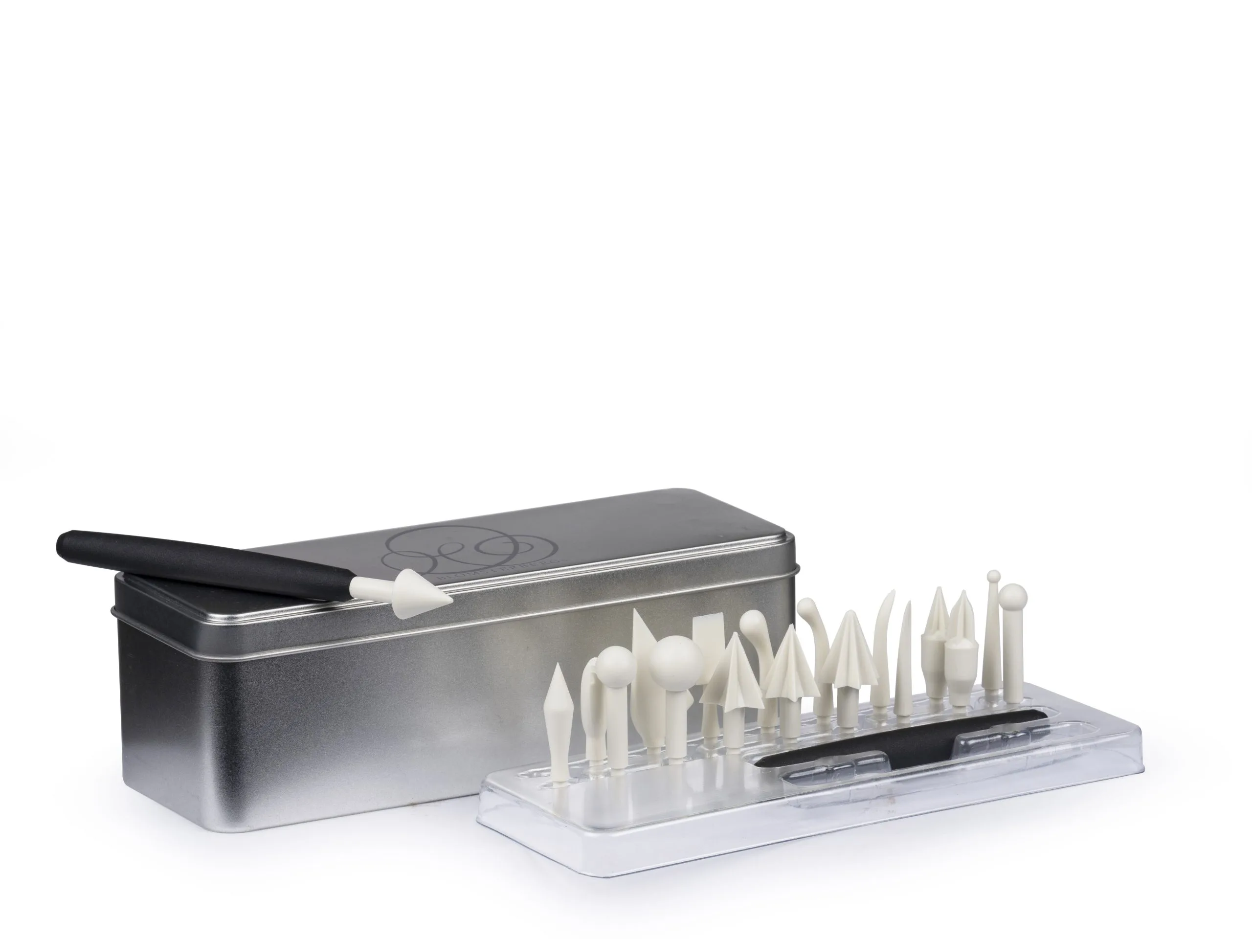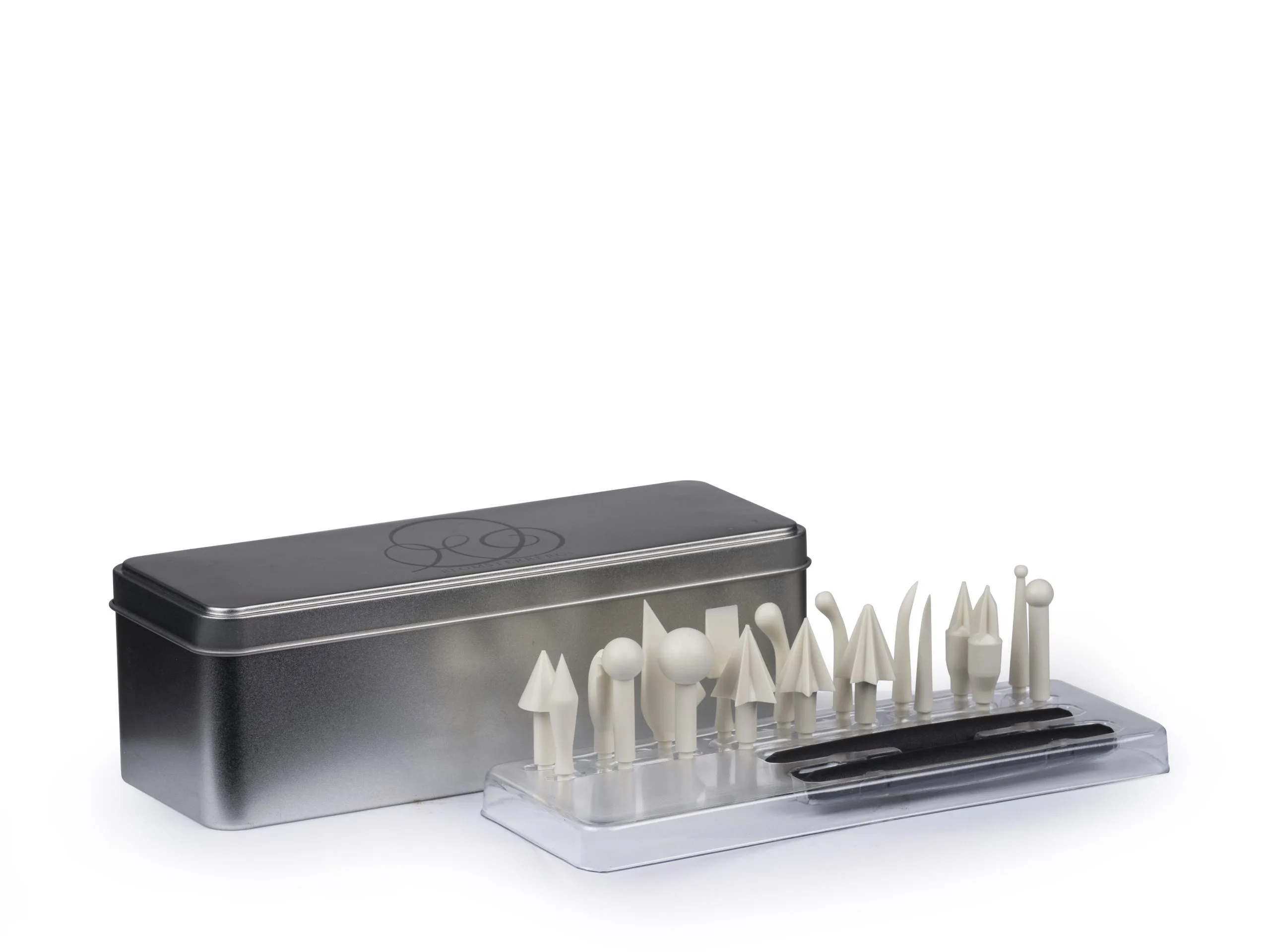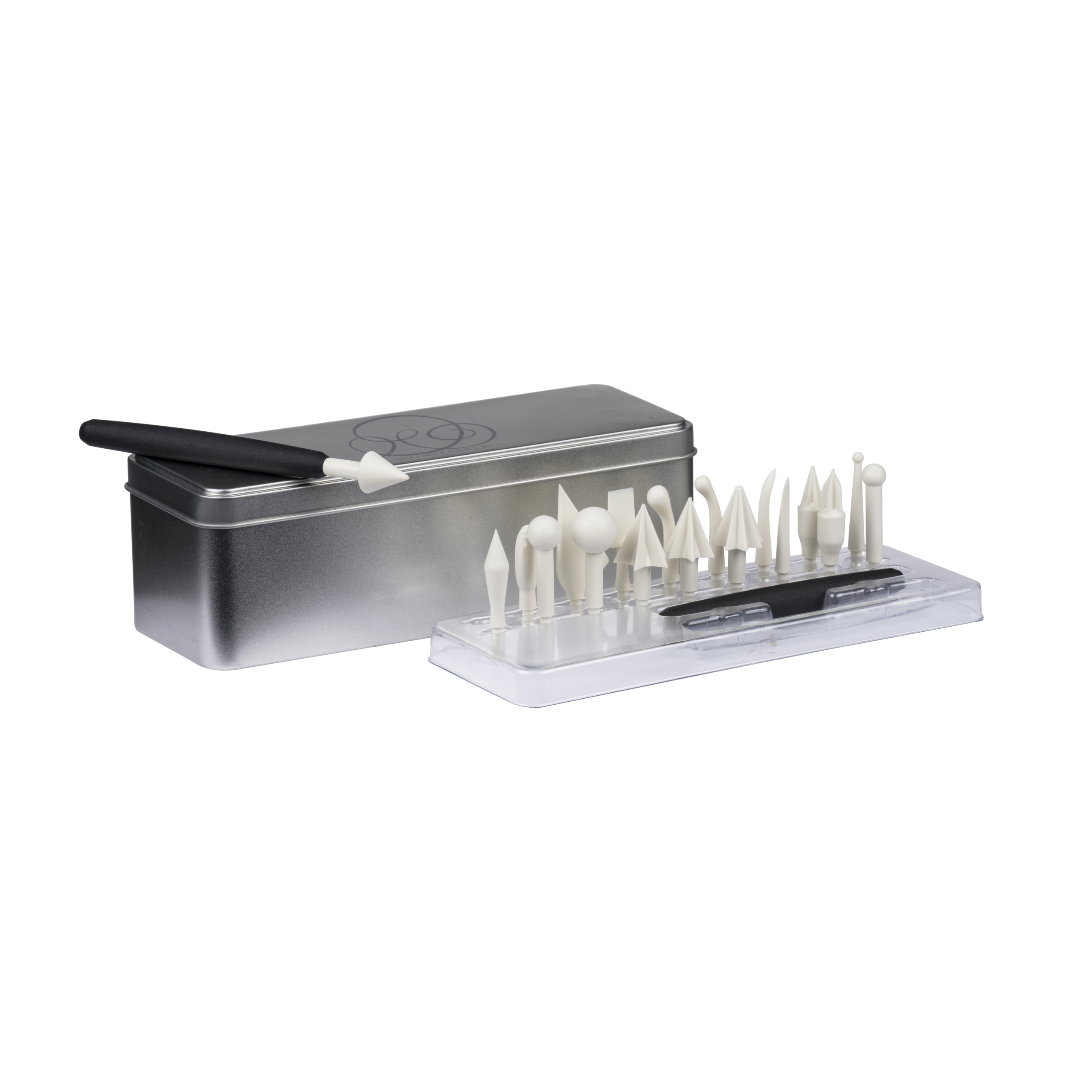 Dekorationspinde til marcipan og fondant. Sættet indeholder to dobbelthåndtag og 18 forskellige redskaber samlet i lækker metalæske. Med de mange forskelligt formede værktøjer kan du modellere mønstre og dekorationer i marcipan og fondant. Længde 16-17,2 cm.