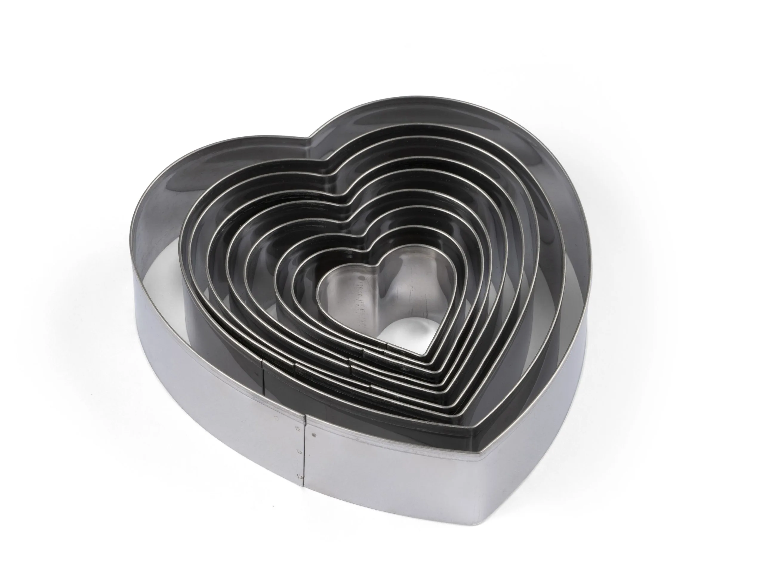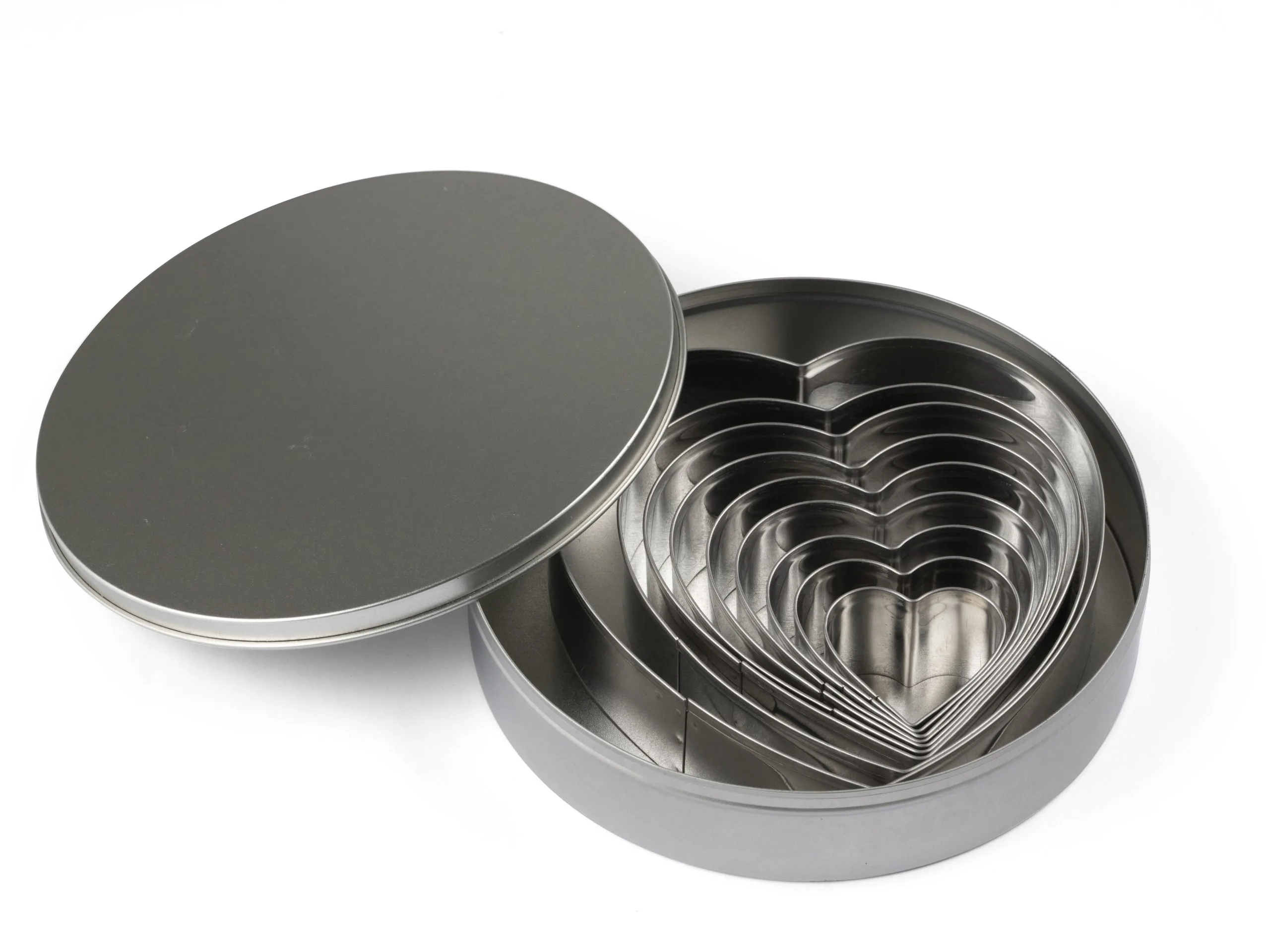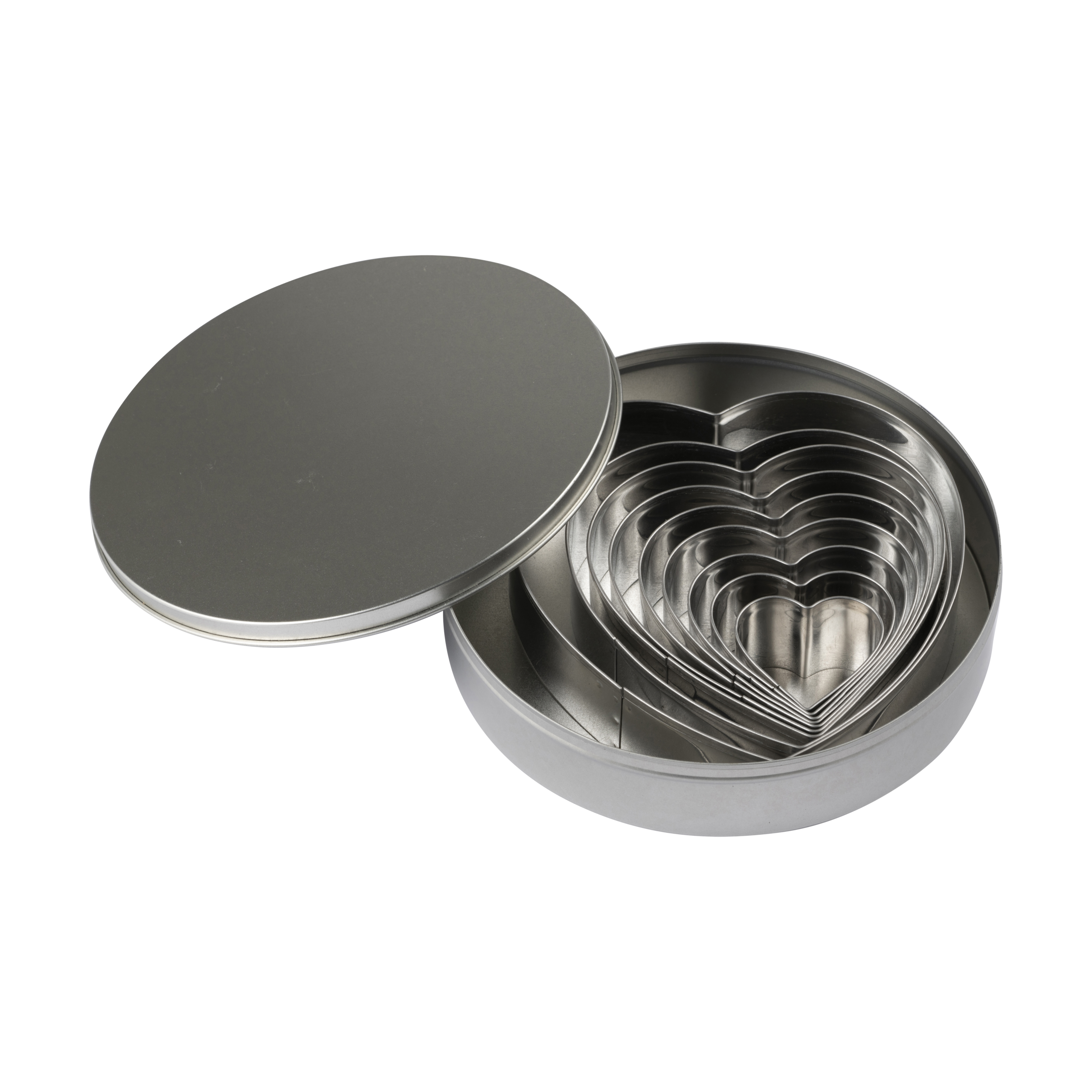Udstikkersæt med 9 hjerteformede udstikkere i rustfrit stål, praktisk samlet i lækker metaldåse. Det perfekte sæt til at udstikke små bunde til kager og desserter, honninghjerter, marcipanskilte, småkager og lignende i forskellige størrelser.