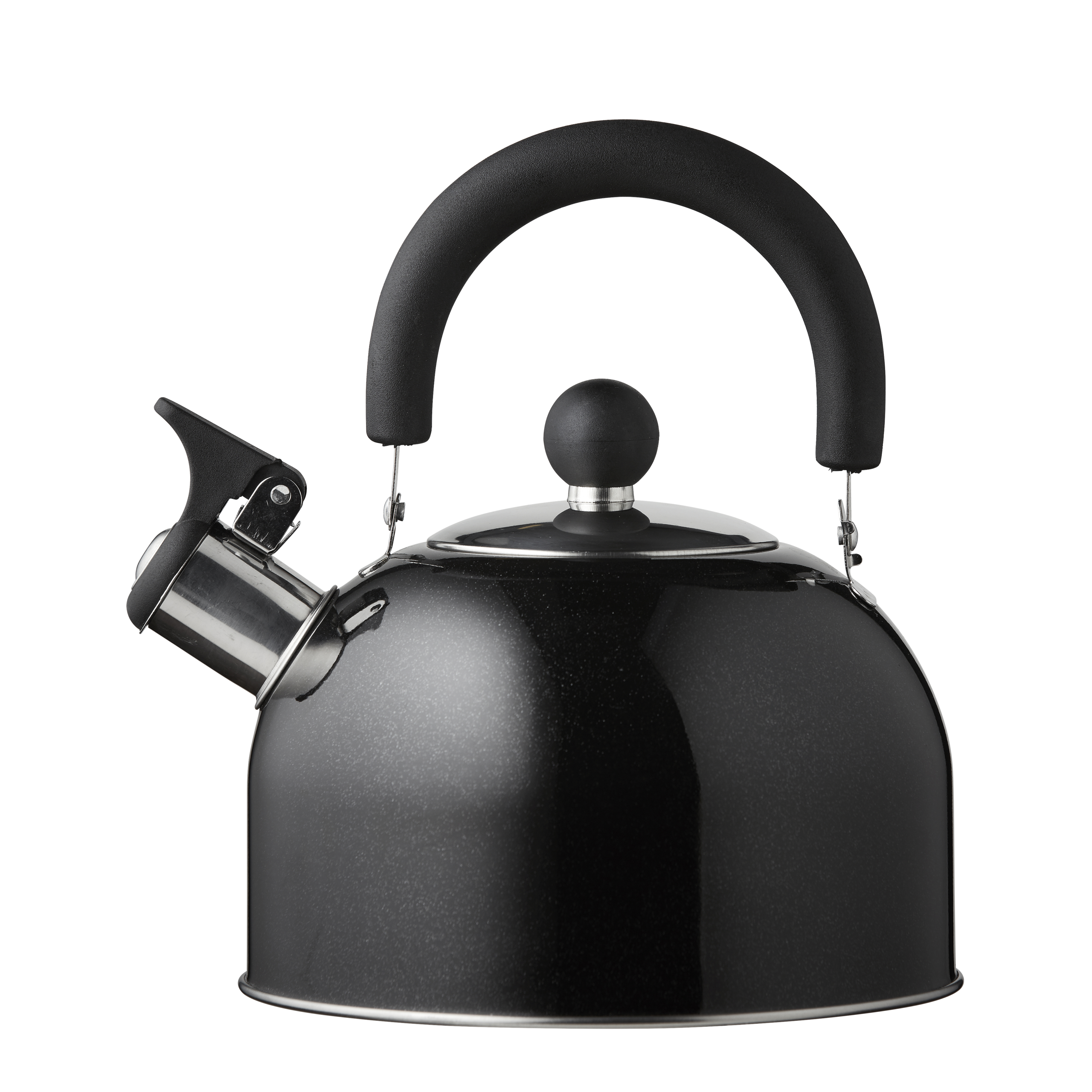 2 liter kedel i sort stål i et enkelt og flot moderne design. Kedlen fløjter, når vandet koger. Kan anvendes på alle varmekilder.