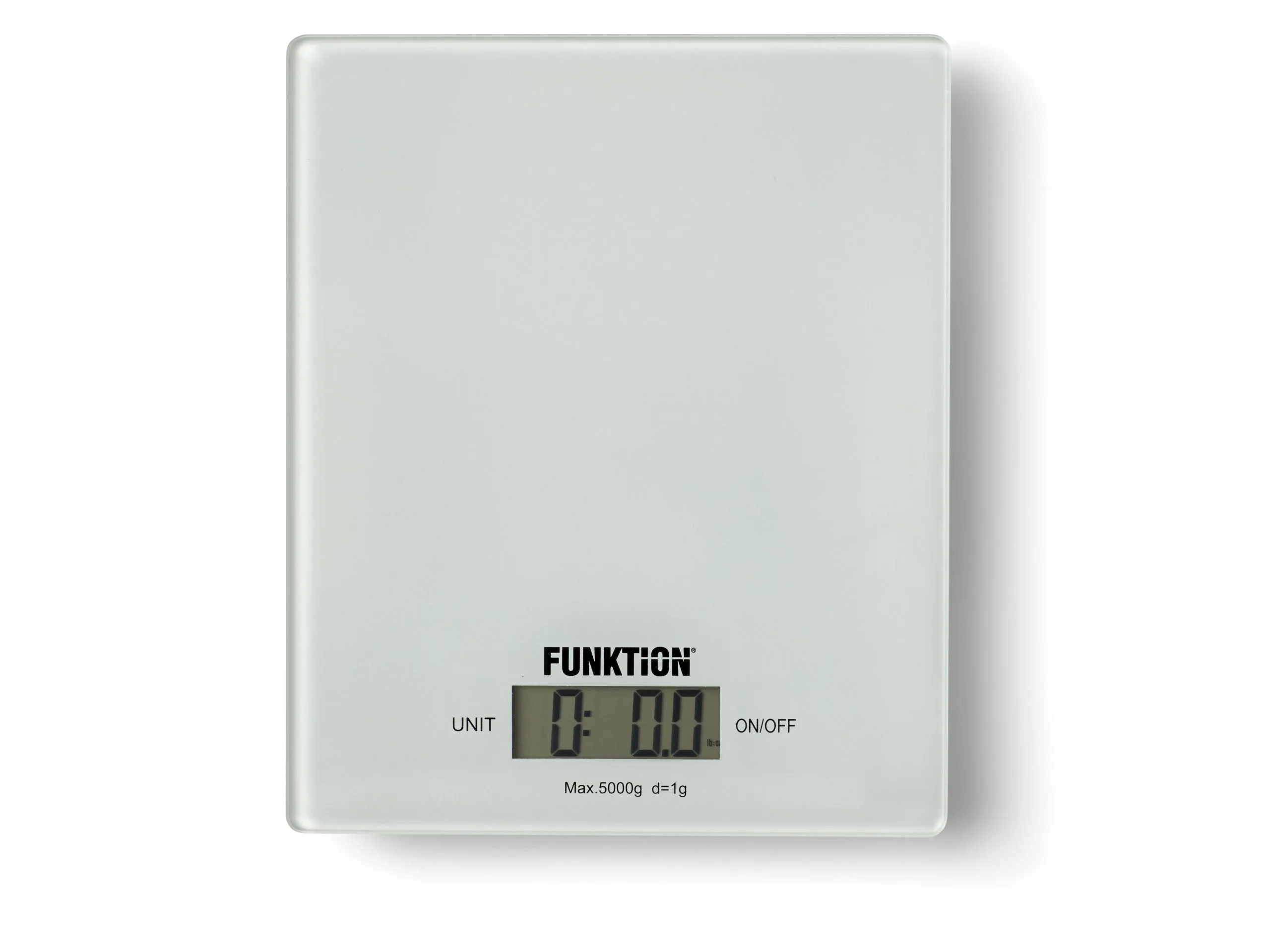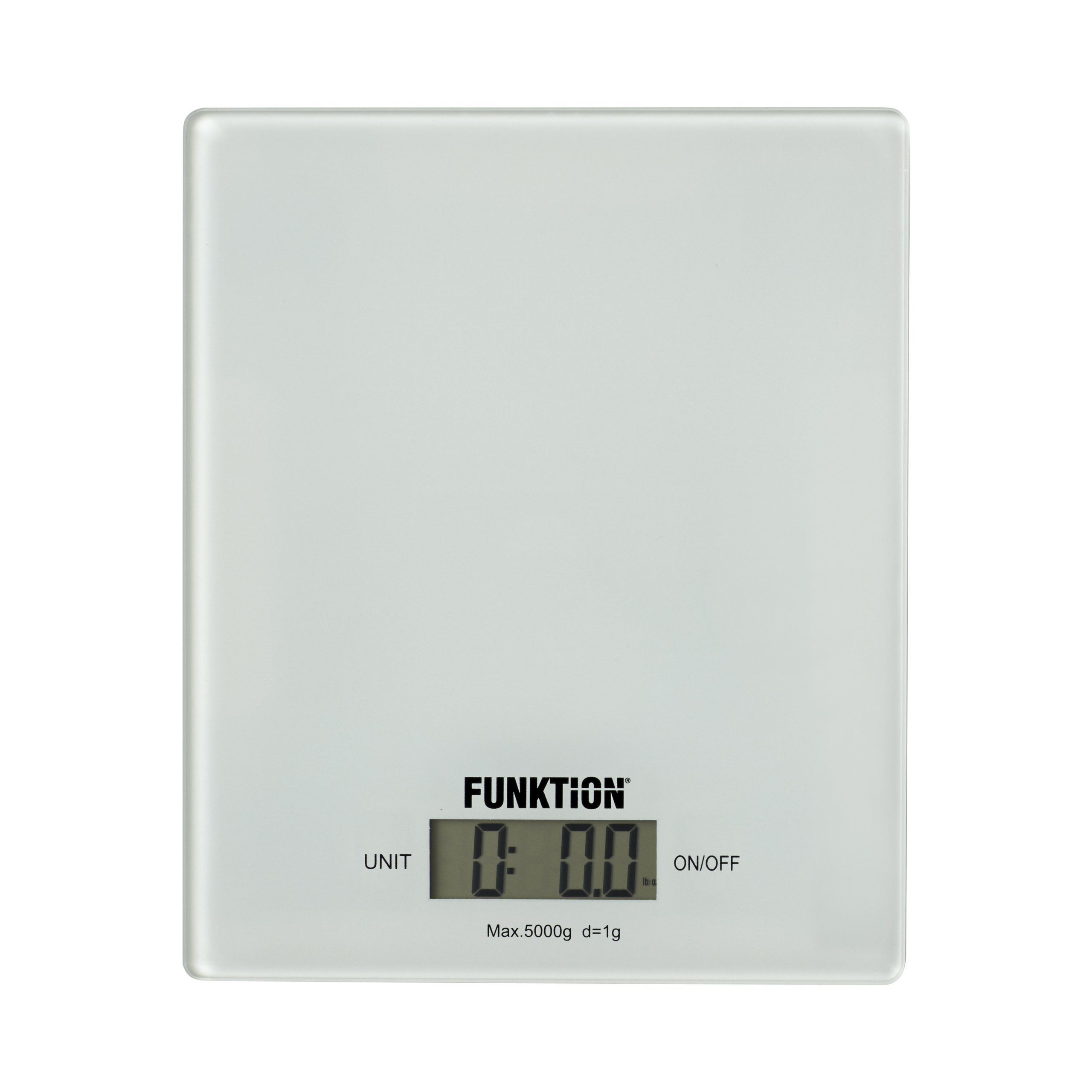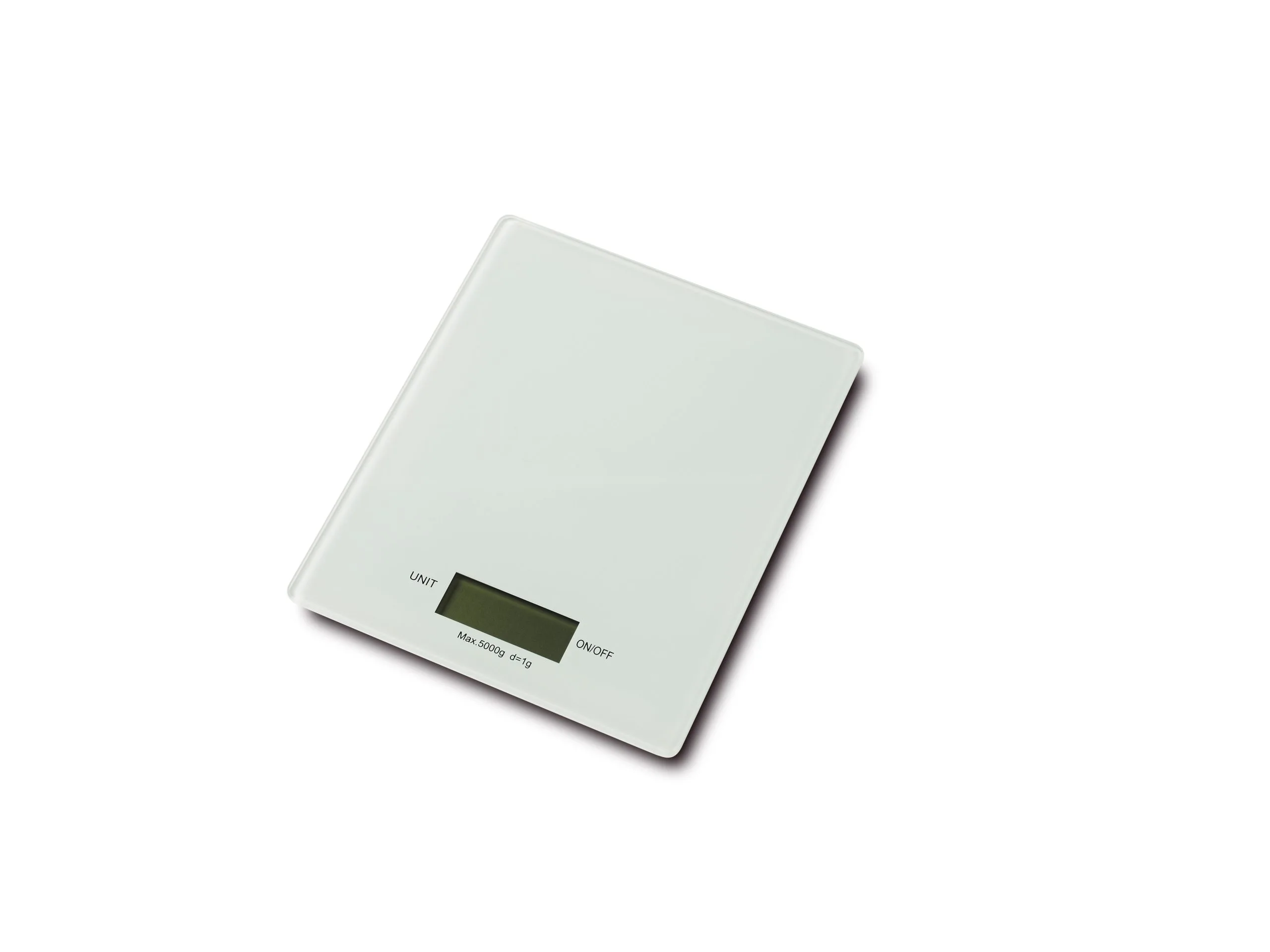 Køkkenvægt i hvid med 5 kg kapacitet og glasoverflade.