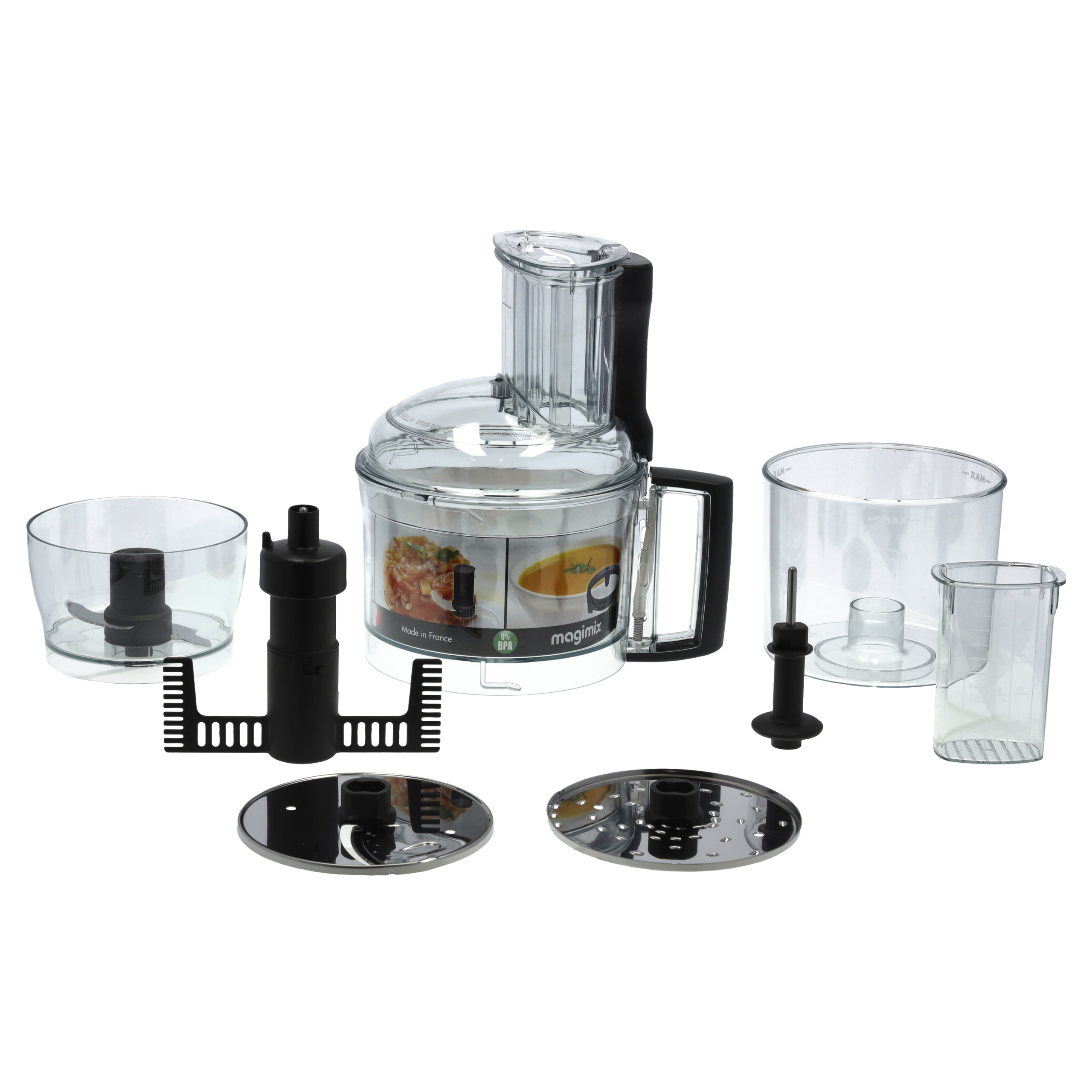 Magimix-sættet består af: 3 skåle, 1 låg, 2 nedstoppere, 1 x 2 mm snitteskive, 1 x 2 mm riveskive, 1 minikniv, 1 aksel og 1 æggepisker.