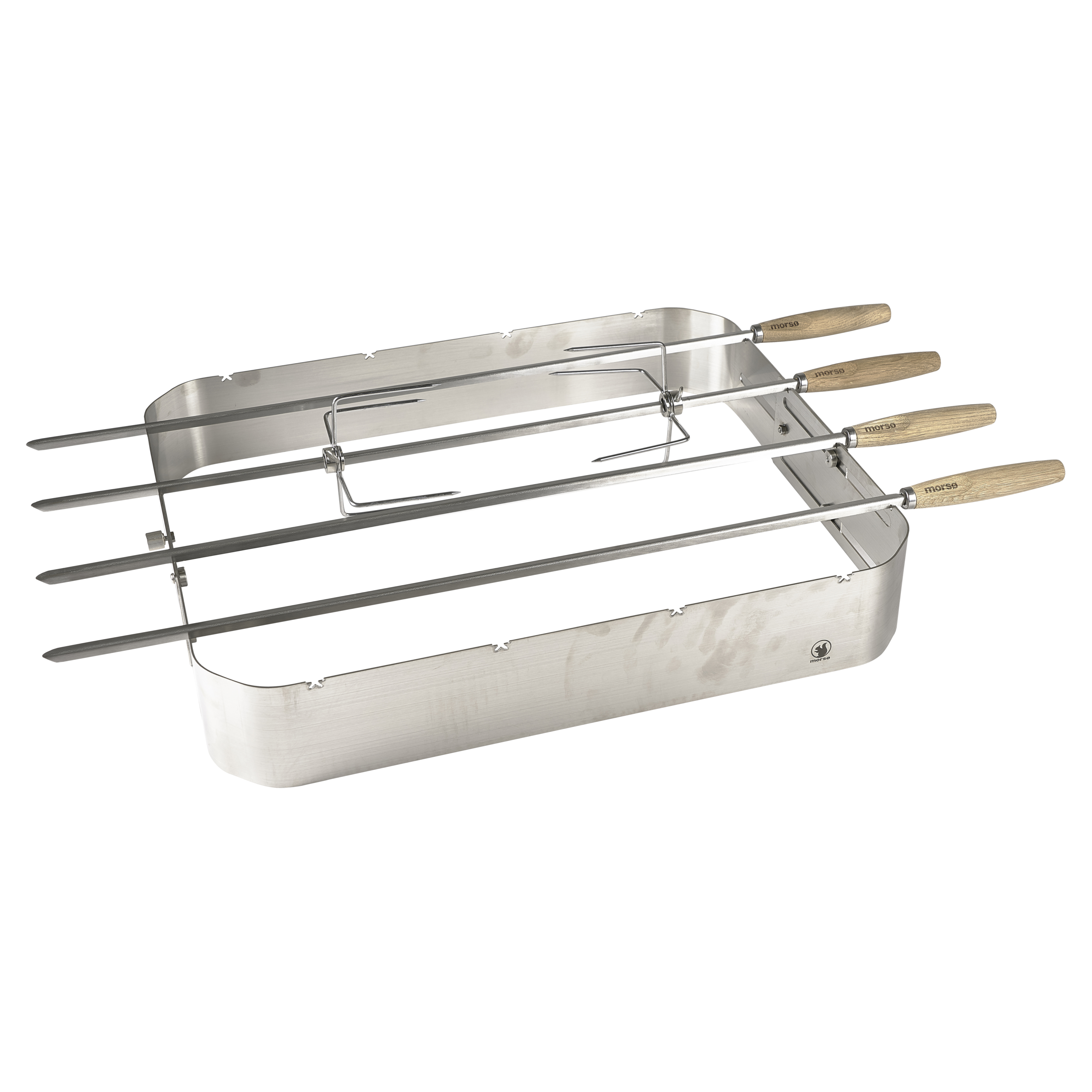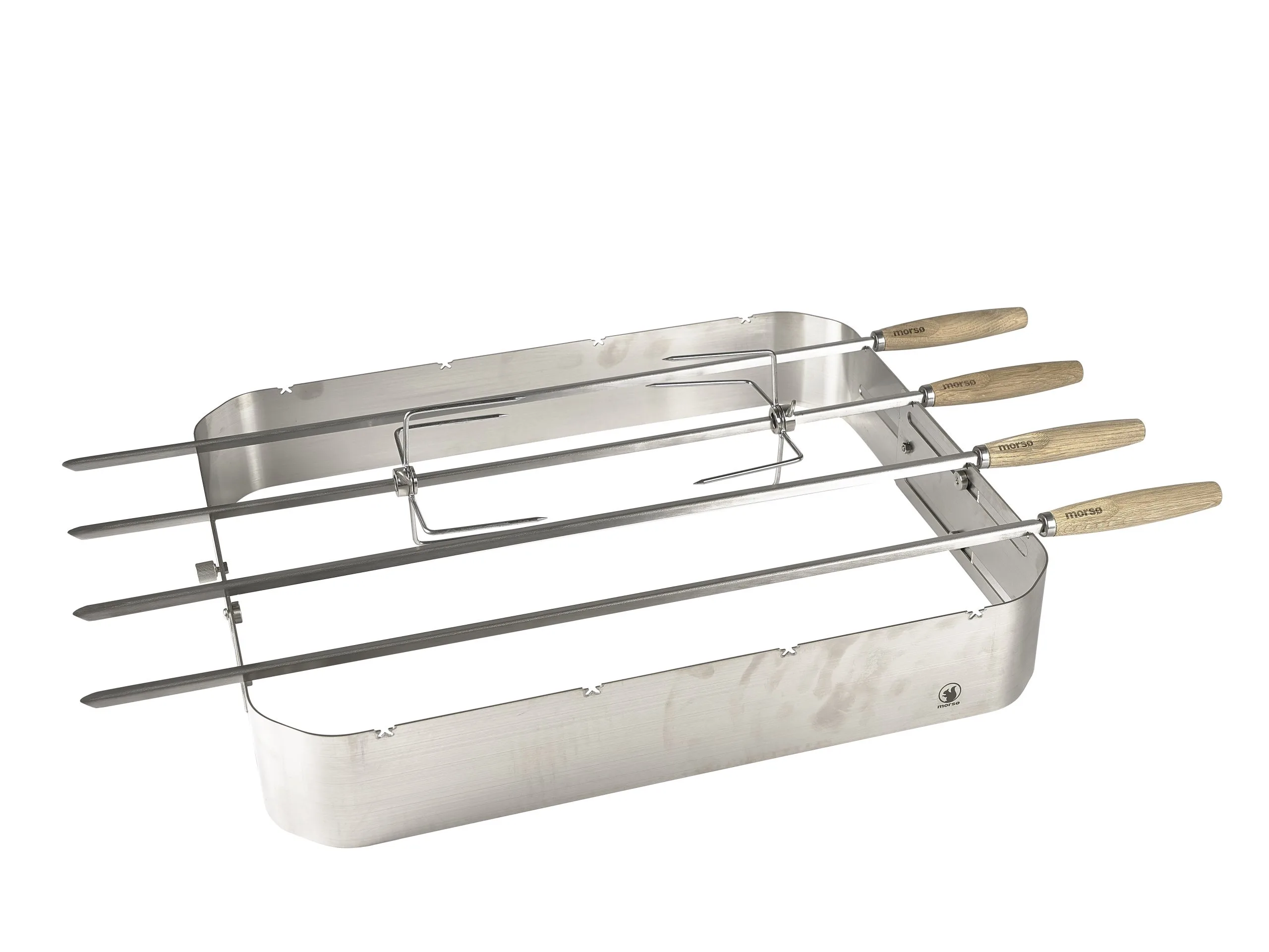 Churrasco til Morsø Grill ’17 og Morsø Forno gør det nemt at tilberede kød, fisk og grøntsager på spyd. Den består af en indstillelig ramme, 4 spyd og 2 gafler i rustfrit stål, som tåler høje temperaturudsving. Spyddene har desuden ergonomisk behagelige greb af olieret egetræ.