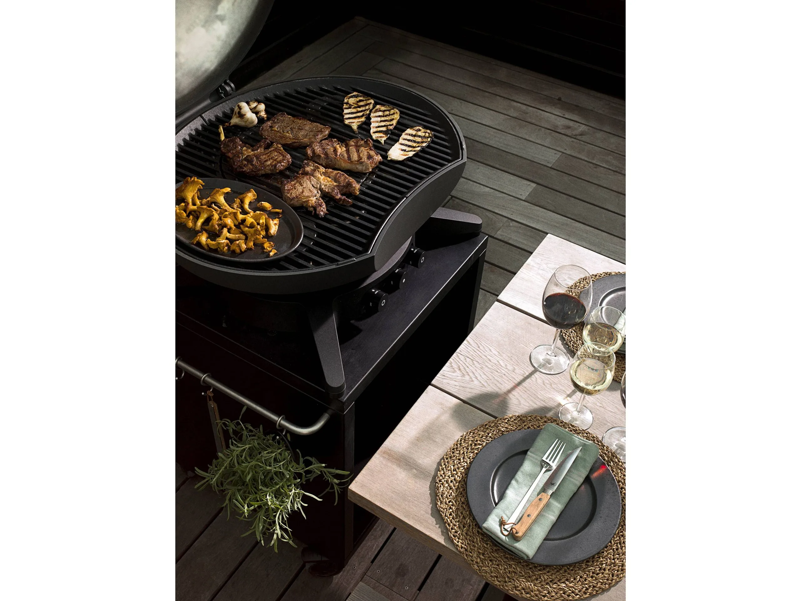Fremstillet i antracitgråt aluminium og med ellipseformet grillrist i støbejern – grilloverflade 53 x 65,6 cm.