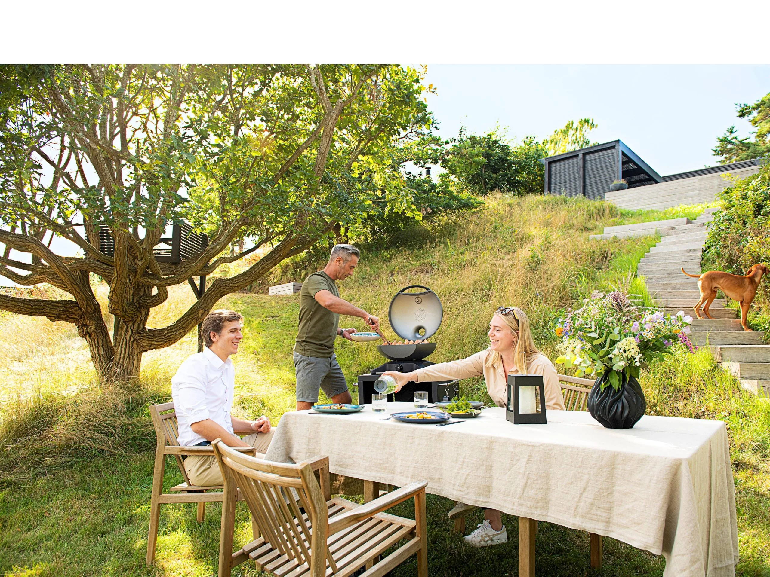 Det minimalistiske greb fuldender formens front, både designmæssigt og ergonomisk. Samtidig giver det fire-benede understel grillen et stabilt fundament, som helt naturligt og diskret danner rum for både betjeningspanel og gastilslutningen.