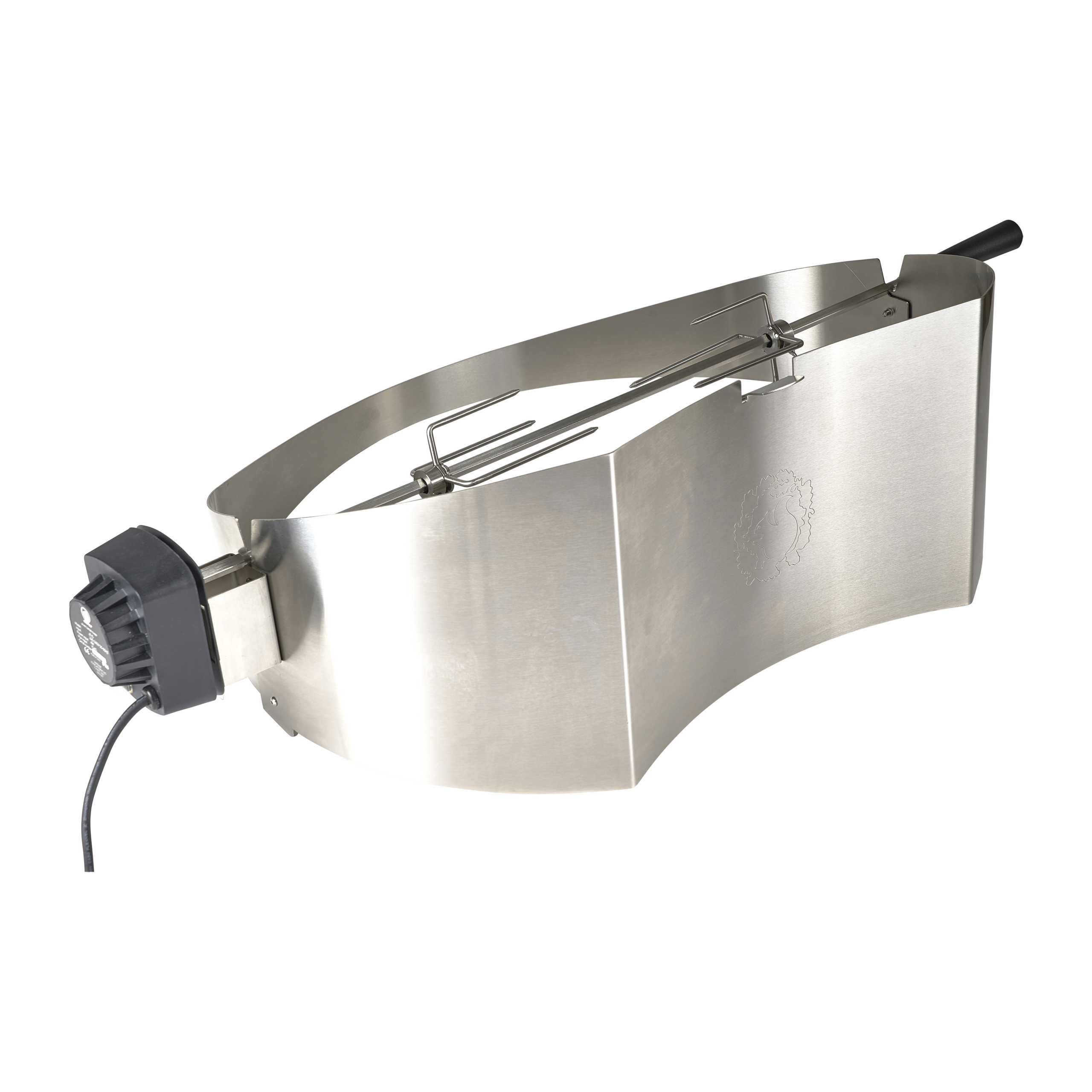 Funktionelt rotisserie til Morsøs populære Forno Gas Grande. Den smukt buede skærm i rustfrit stål kiler sig elegant ind under grillens låg og skaber derved god plads til at rotere selv store mængder, og der er plads til en saftopsamler mellem spyd og grilllegeme.