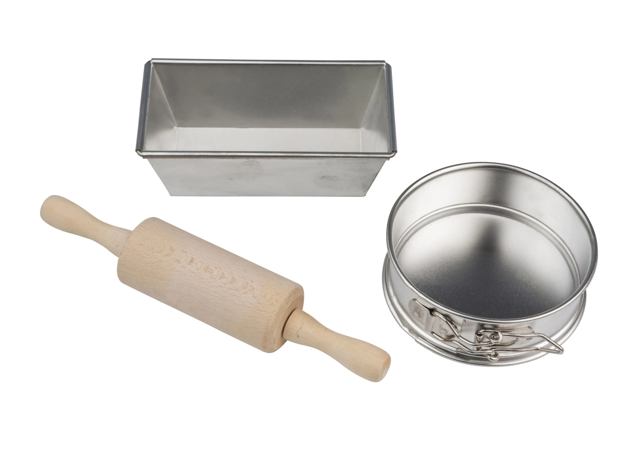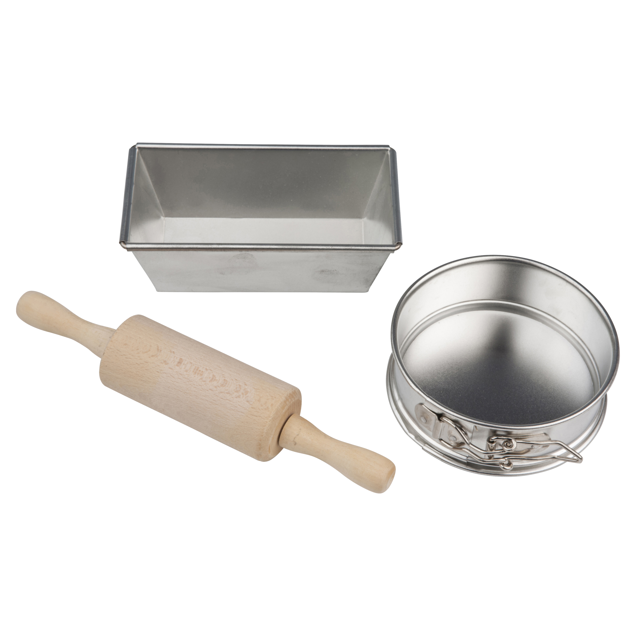 Børnebagersæt i fortinnet 0,3 mm koldvalset stål, som sikrer en god varmefordeling. Sættet består af 3 dele herunder en kagerulle af træ, en kageform og en rund springform. Så bliver det ikke nemmere at have børnene med i køkkenet. Tåler ikke maskinopvask.