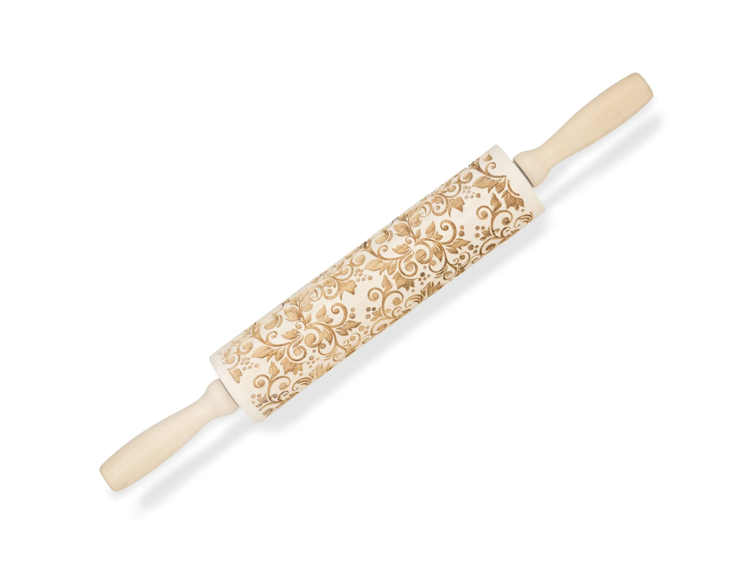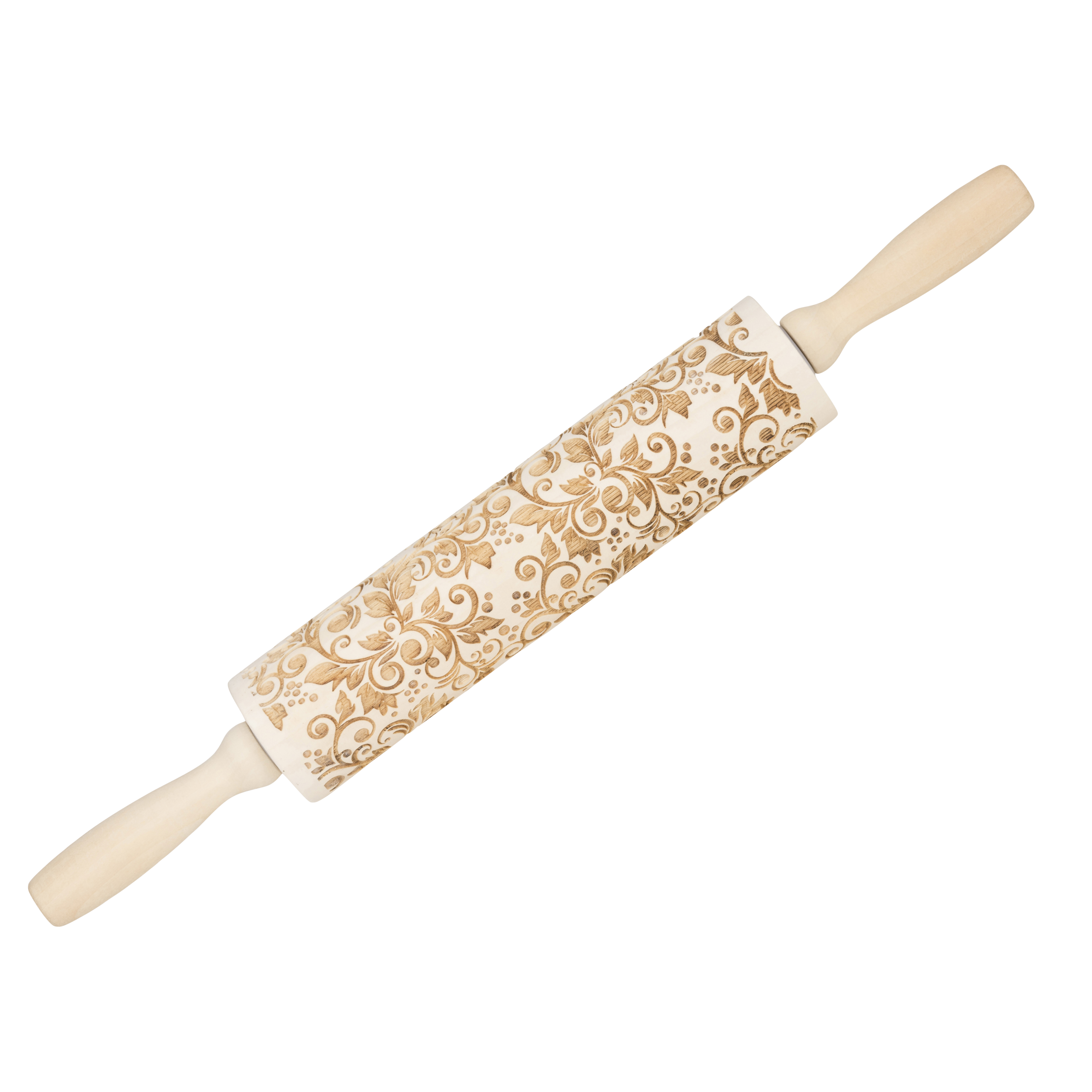 Kagerulle i bøgetræ med bladmønster. Perfekt til at skabe et smukt og dekorativt mønster, når du udruller dej eller fondant. Rul først dejen ud med en almindelig kagerulle, og anvend derefter den specielle kagerulle for at frembringe mønsteret. Rullen er 20/39 cm lang. Tåler ikke maskinopvask.