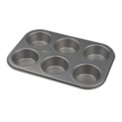 Patisse Silvertop muffinform til 6 stk. med non-stick-belægning. Tåler temperaturer fra -60 °C til 230 °C. Robust kvalitet produceret i 0,6 mm koldvalset stål, som sikrer en god varmefordeling. Patisse er et hollandsk firma, der har produceret kvalitetsbageartikler siden 1988. Sortimentet omfatter et stort og spændende sortiment i høj kvalitet. Alle produkter er produceret på egen fabrik i Europa og eksporteres til mere end 50 lande verden over. Tåler ikke maskinopvask. 5 års garanti.