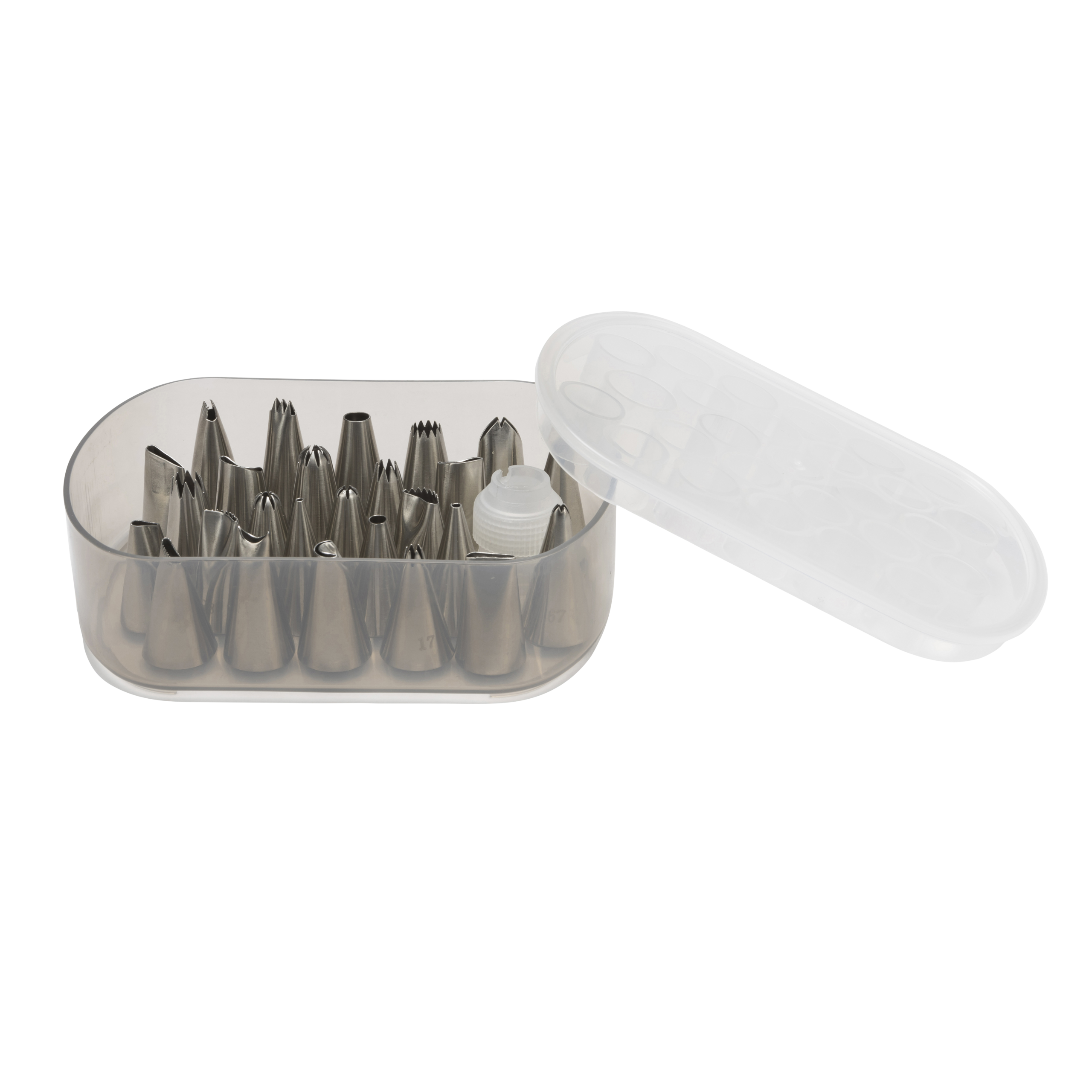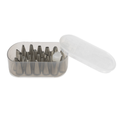 Dette tyllesæt består af 26 forskellige tyller i rustfrit stål samt en tylle-kobling i plast. Tyllerne kommer i en praktisk plastboks, og sættet er perfekt til den kreative bager, der elsker at dekorere kager og desserter, som imponerer gæster ved festlige lejligheder. Tyllerne tåler maskinopvask.