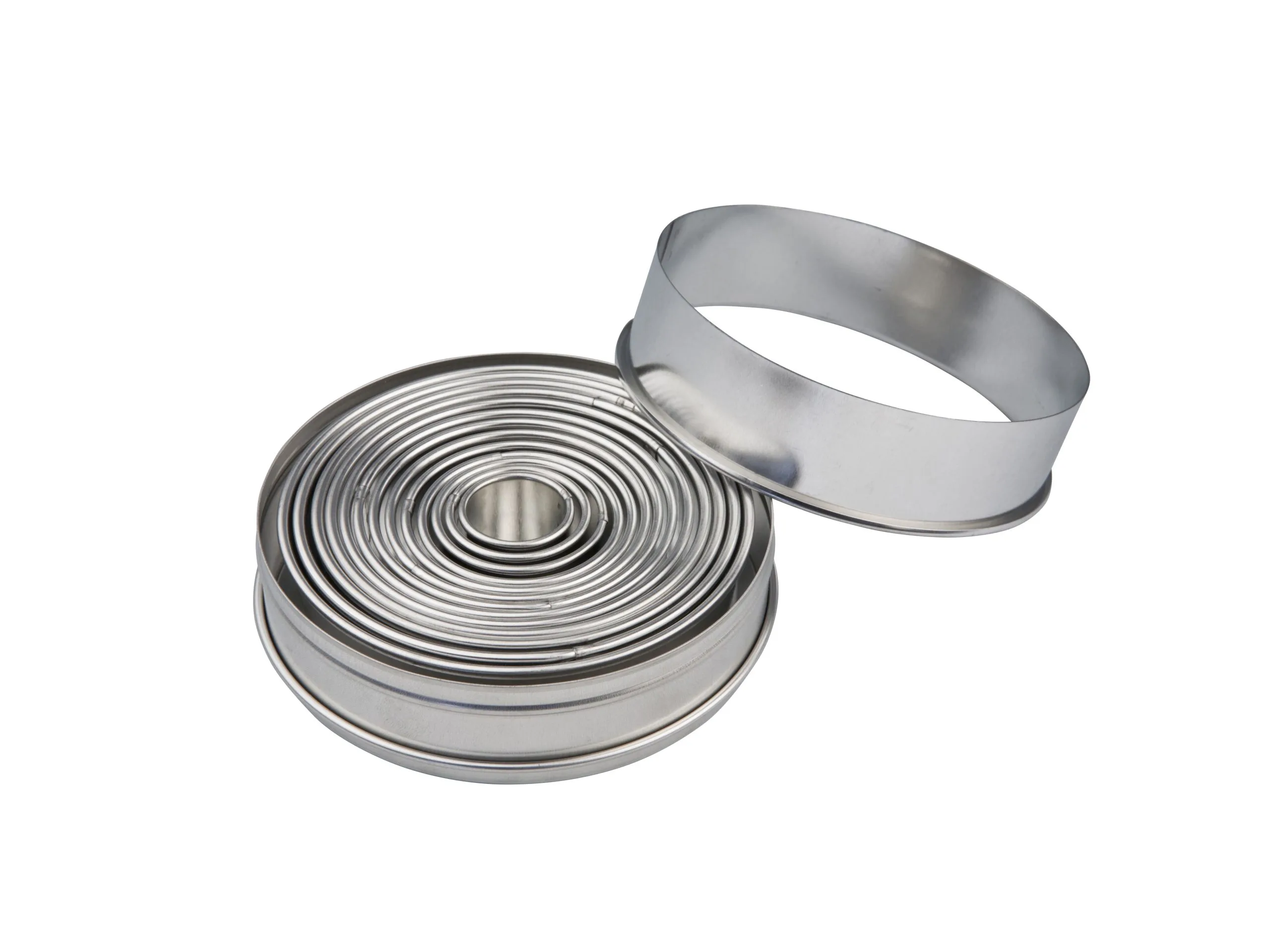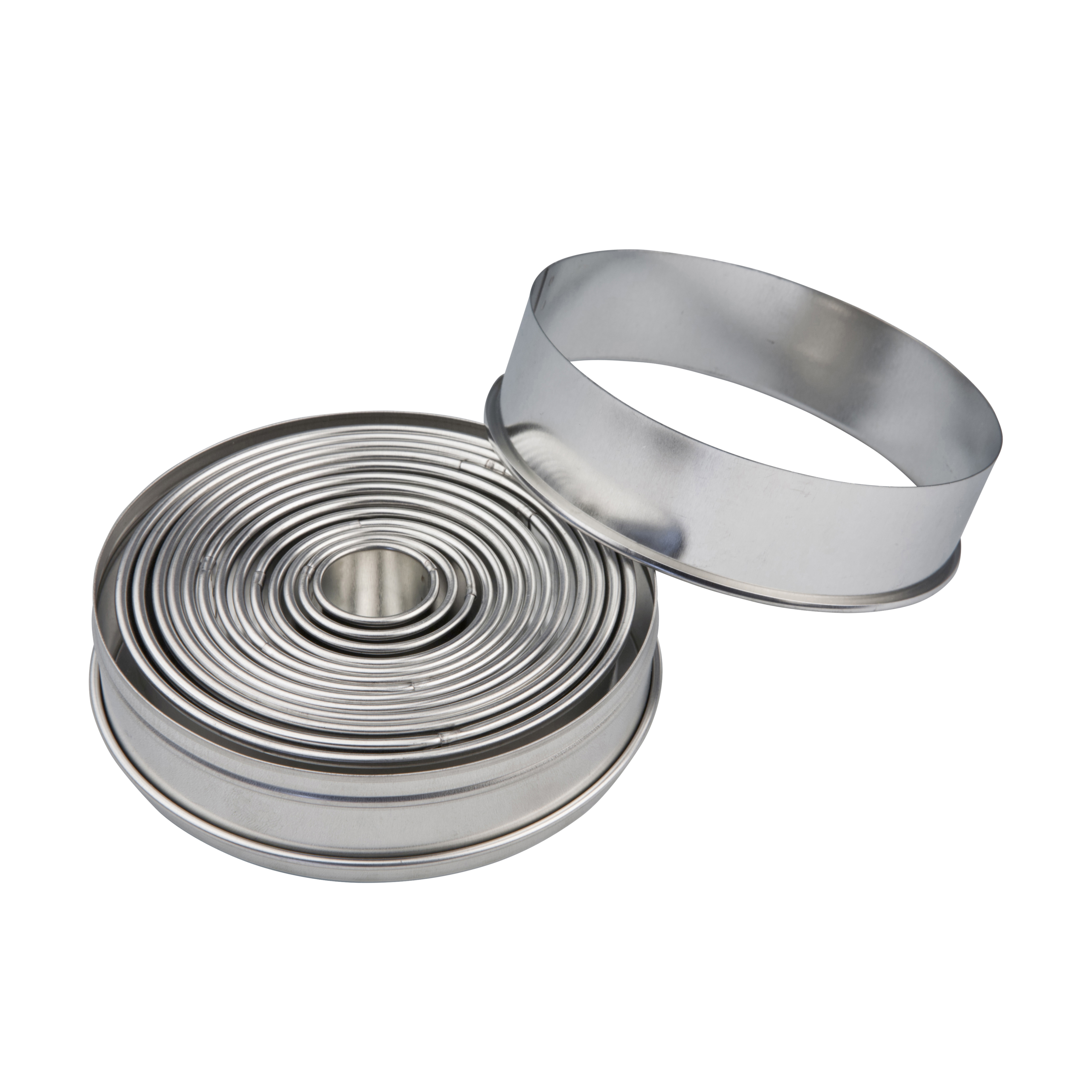 Udstikkersæt med 14 ringformede udstikkere i rustfrit stål. Udstikkerne har en diameter på mellem 2,5 og 11,5 cm og opbevares i en praktisk stålboks. Perfekt til at udstikke småkager og kagebunde i forskellige størrelser. Tåler maskinopvask.