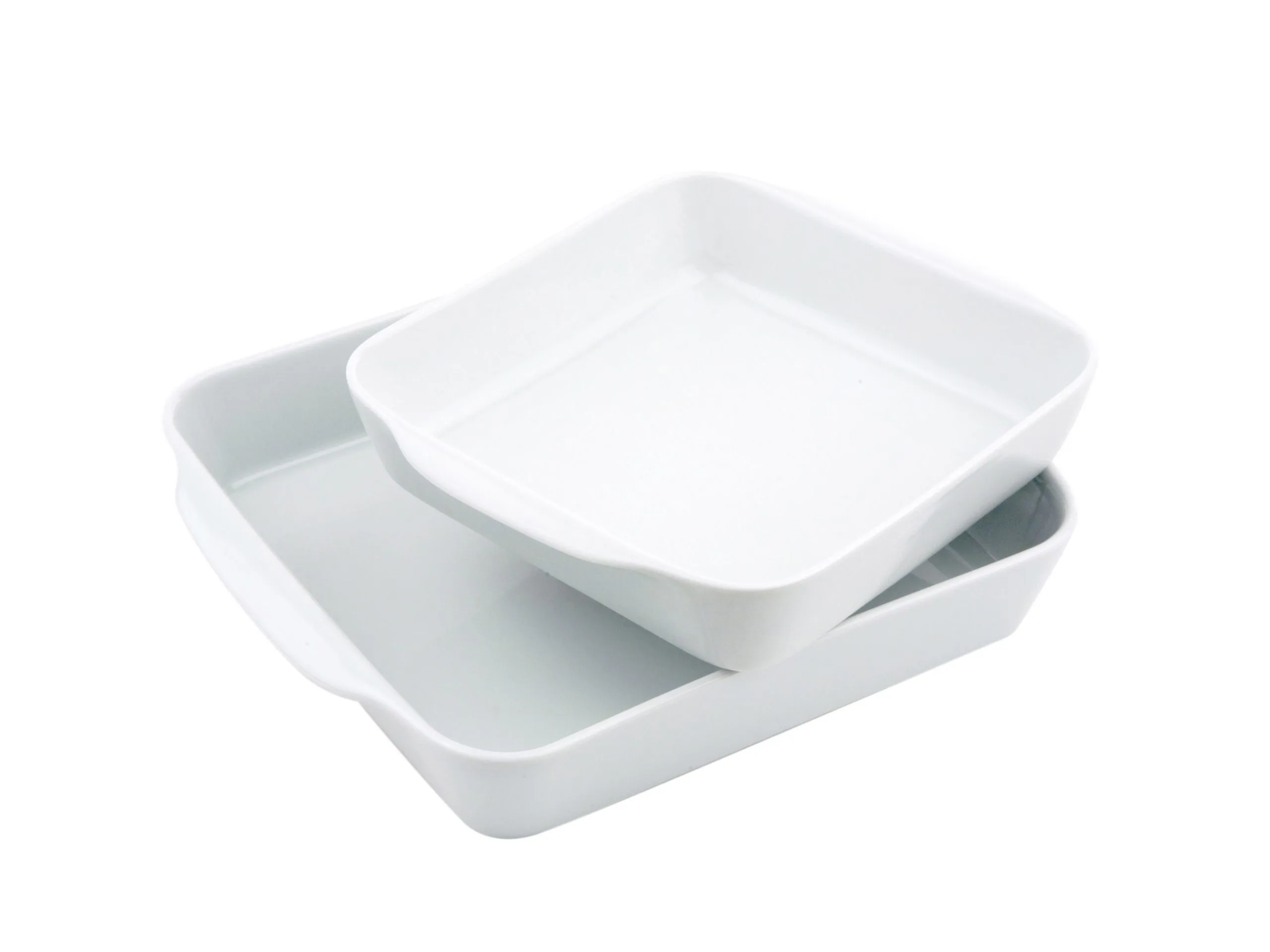 Kvadratiske fade med håndtag 22 x 22 cm og 27 x 27 cm til ovnretter og til servering.