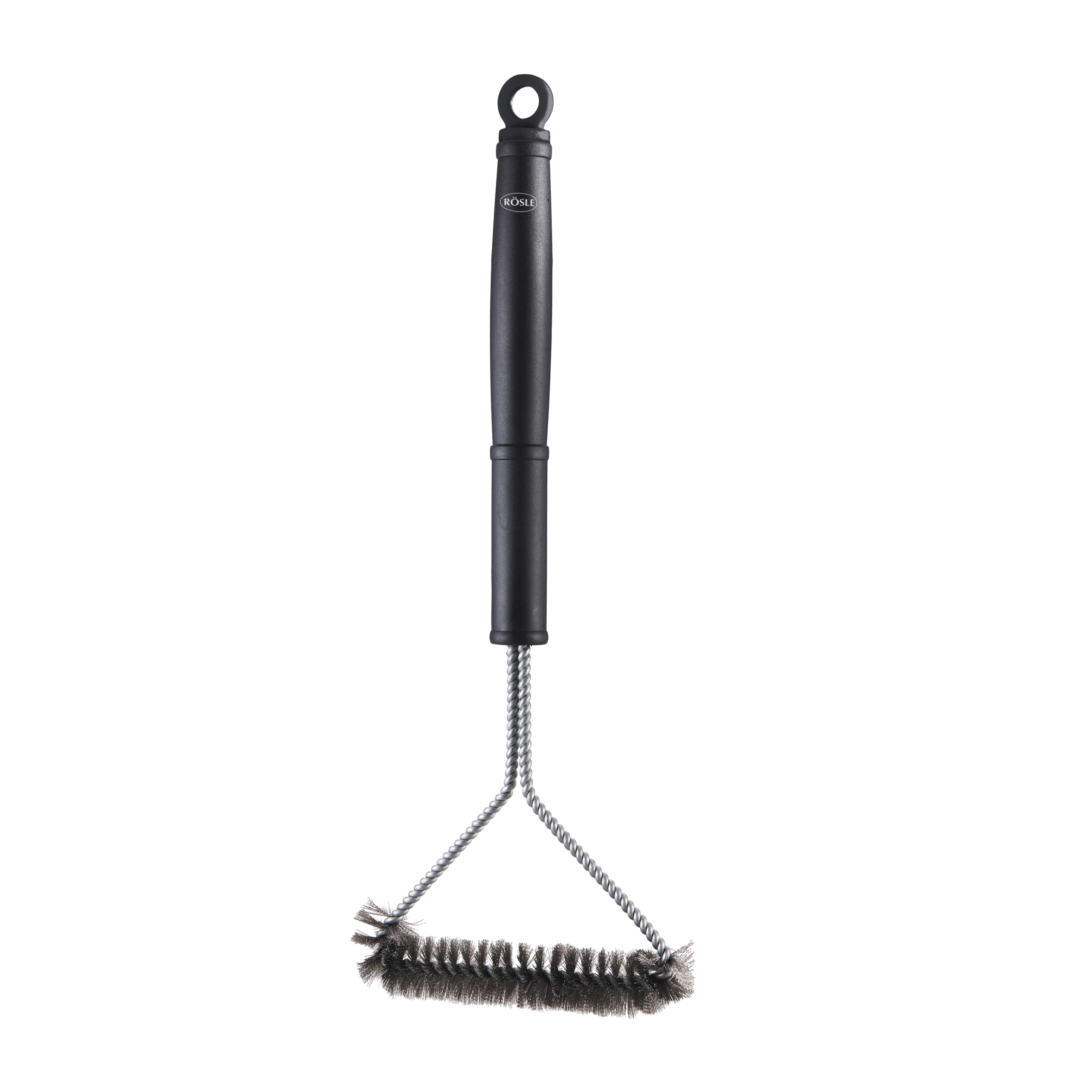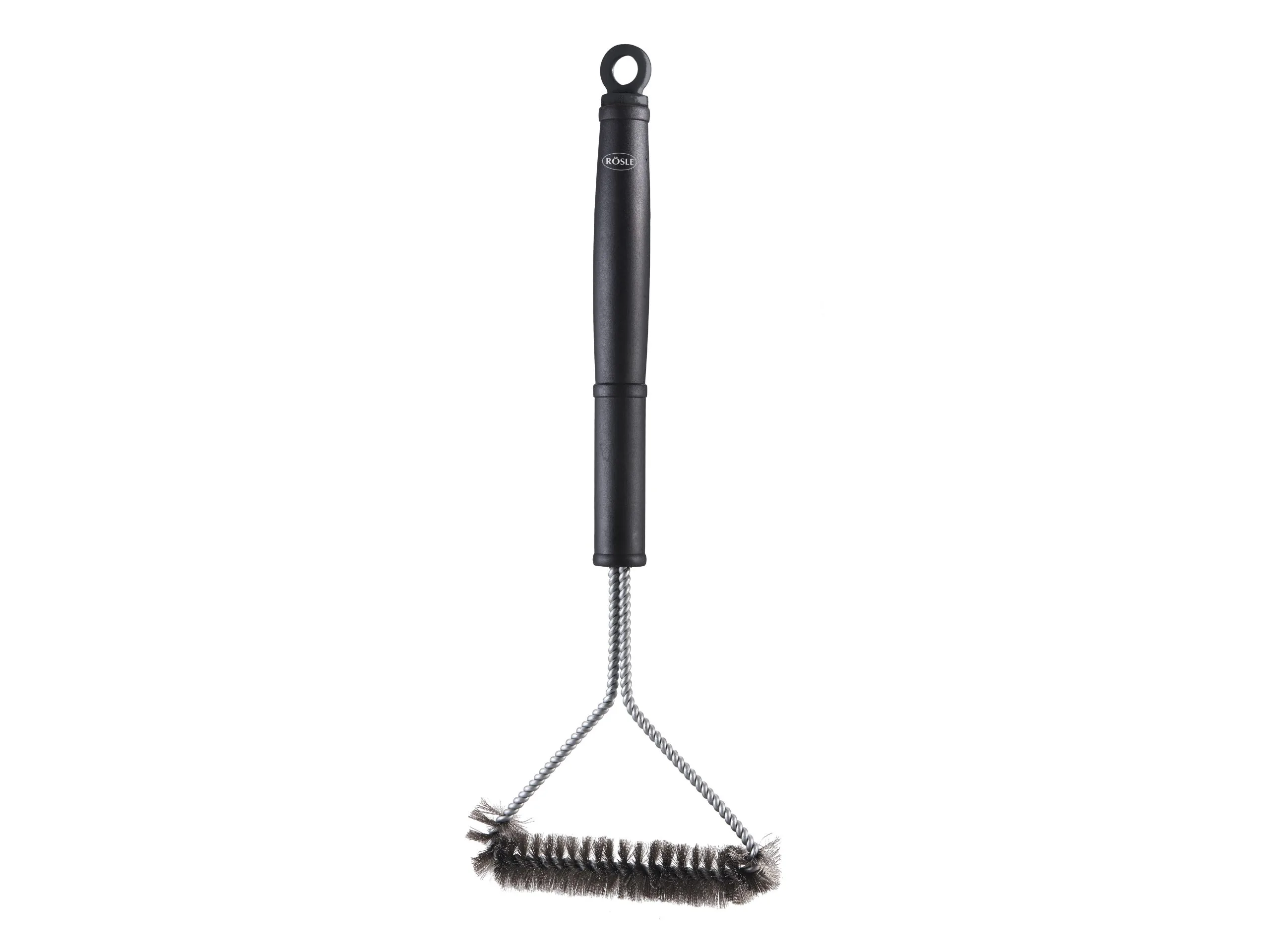 Grillbørste til rengøring af grillriste lavet af rustfrit stål, krom og emalje. Børstehoved af stål. Begge sider kan anvendes. Børsten er 16,5 cm bred. Ergonomiske håndtag af sort plastik.