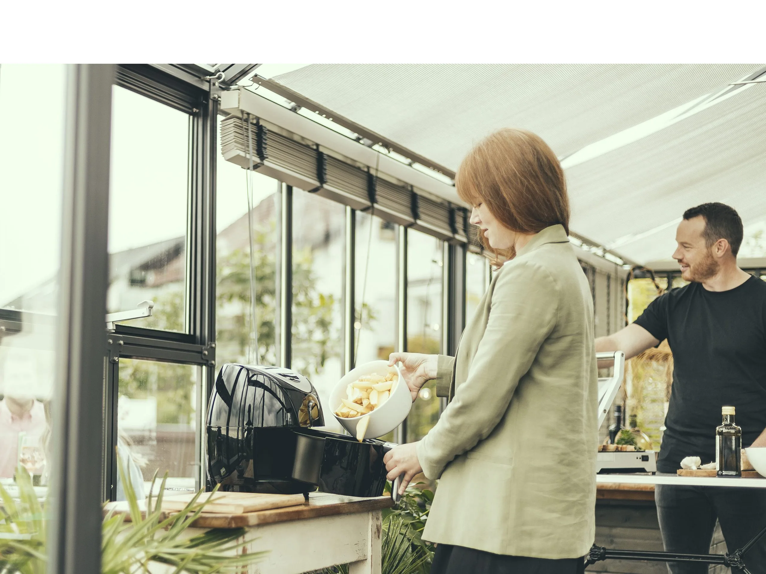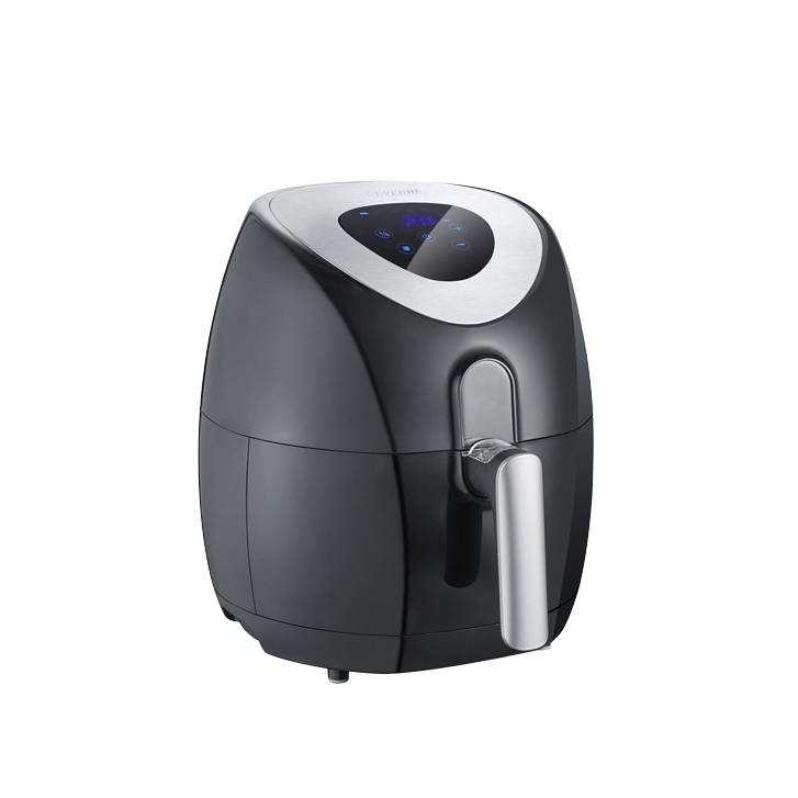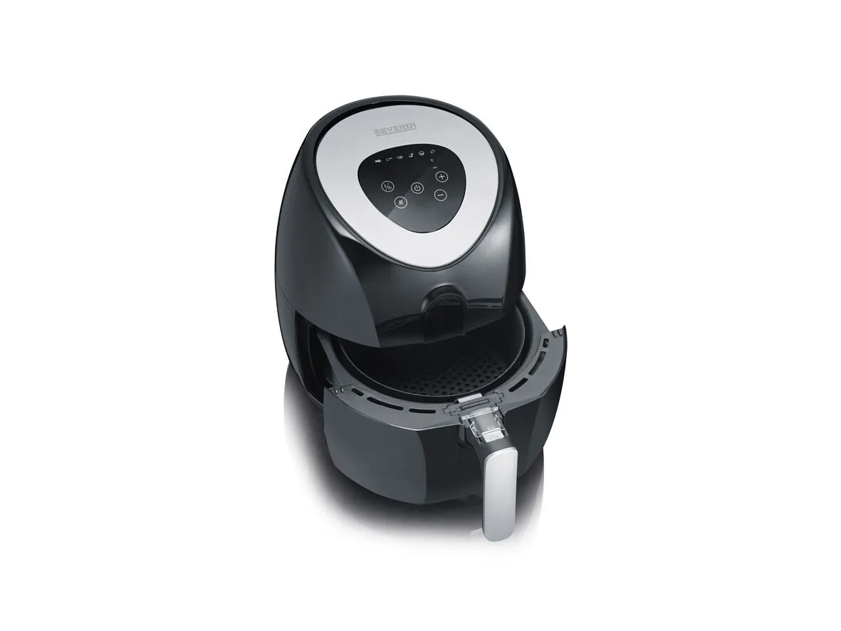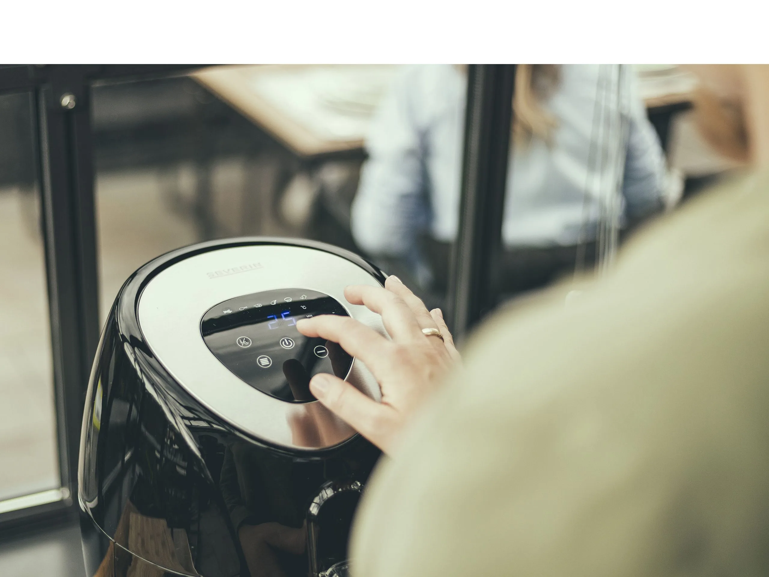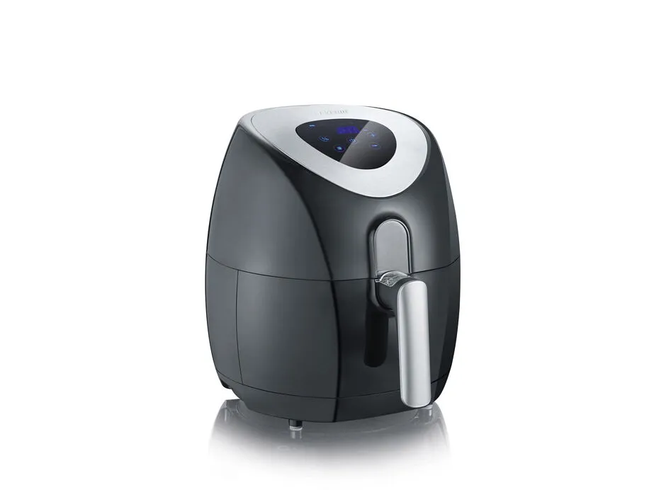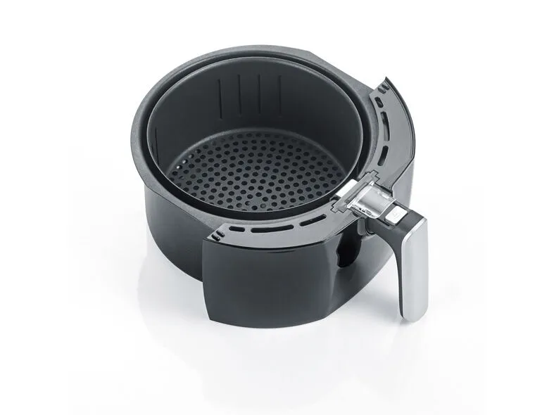 Airfryer 3,2 liter. 1500 watt. Steg sprødt og saftigt uden tilsætning af fedtstof, men blot med varm luftcirkulation. Anvendelig til både kød, fisk og grøntsager. Aftagelig stegekurv med keramisk belægning, enkelt betjent LCD touch-display, 6 forvalgte programmer, 60 minutters timer, temperaturregulering fra 80 til 200 °C og automatisk sluk, når tilberedningen er færdig eller kurven fjernes.