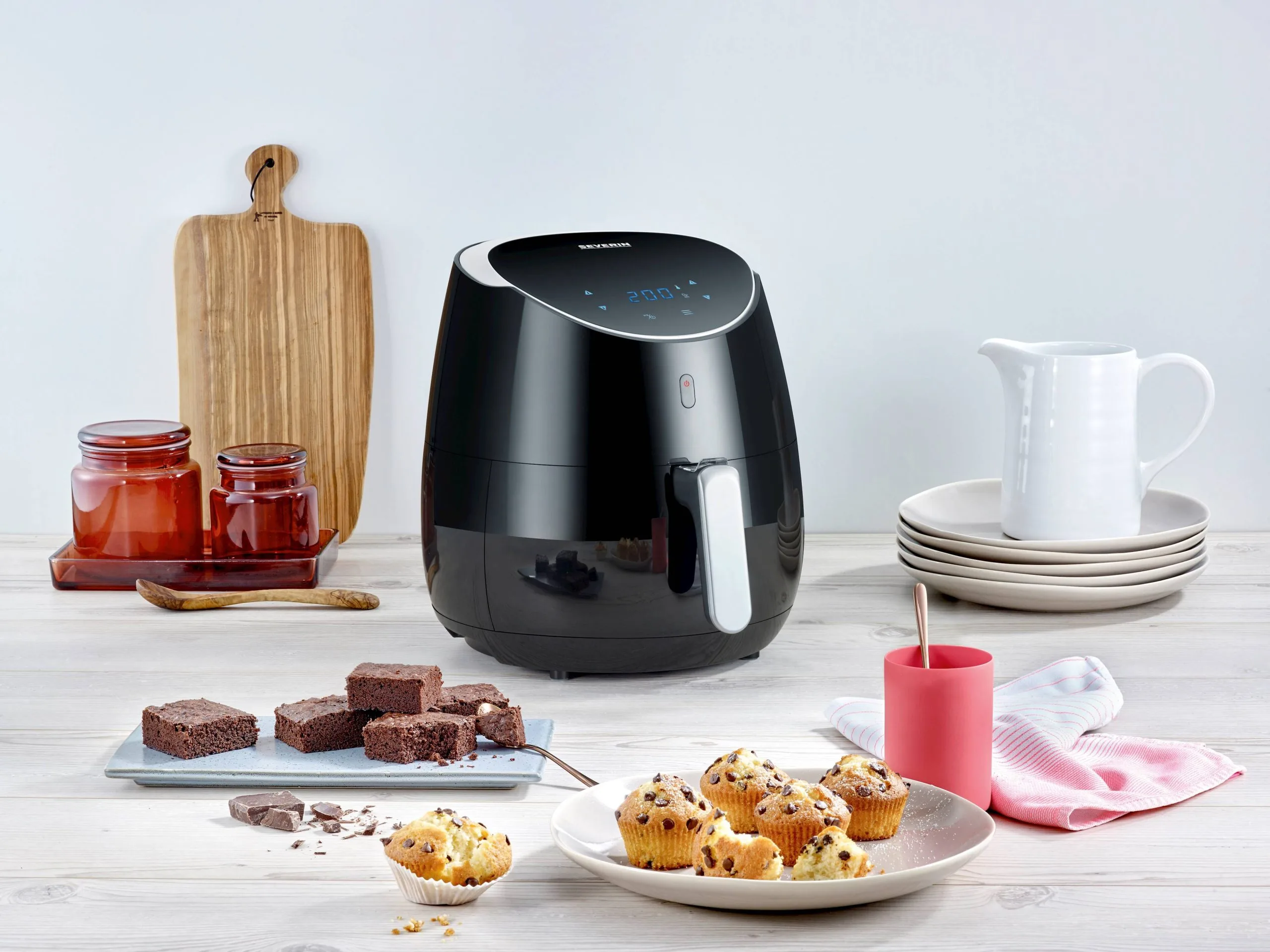 Airfryer 5 liter. 2000 watt. Steg sprødt og saftigt uden tilsætning af fedtstof, men blot med varm luftcirkulation. Anvendelig til både pommes frites, kød, fisk og grøntsager, endda en hel kylling. Aftagelig stegekurv med keramisk belægning, enkelt betjent LCD touch-display, 8 forvalgte programmer, 60 minutters timer, temperaturregulering fra 80 til 200 °C og automatisk sluk, når tilberedningen er færdig eller kurven fjernes.