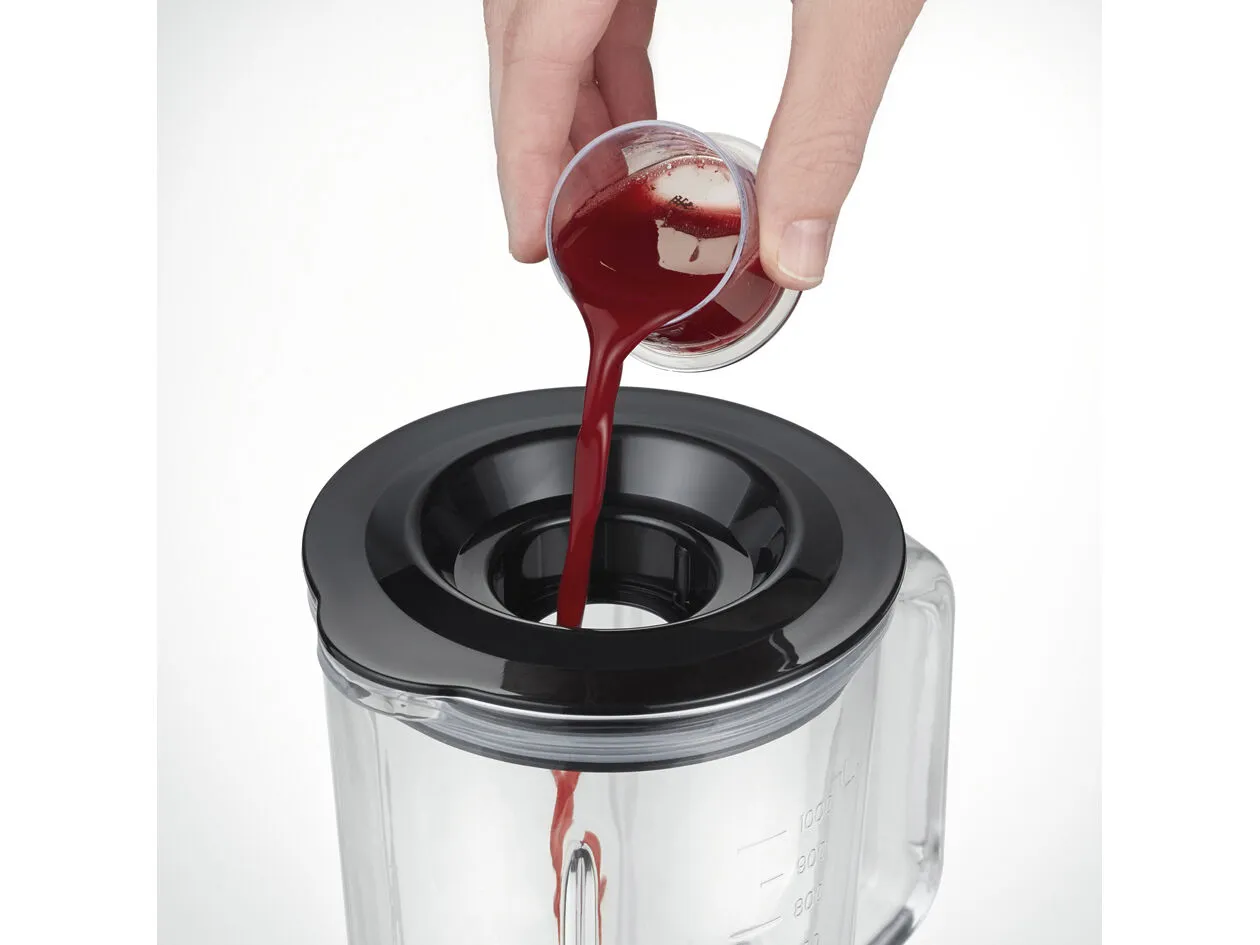 I glaskandens låg er der en praktisk åbning, som gør det nemt at tilføje ingredienser. Overflødig ledning kan gemmes væk i et integreret rum. Blenderen har non slip fødder og står sikkert på køkkenbordet. Flot og stilrent design i børstet rustfrit stål.