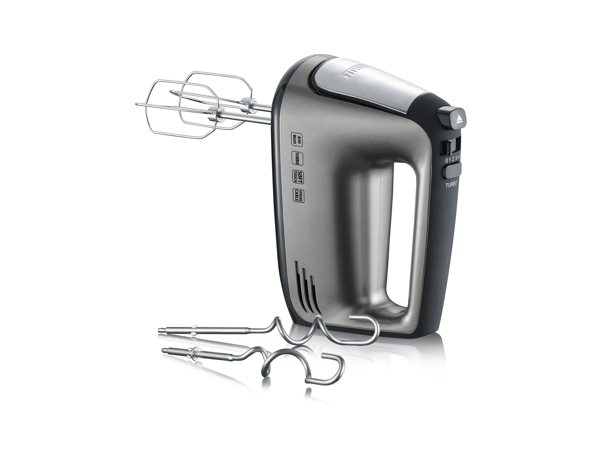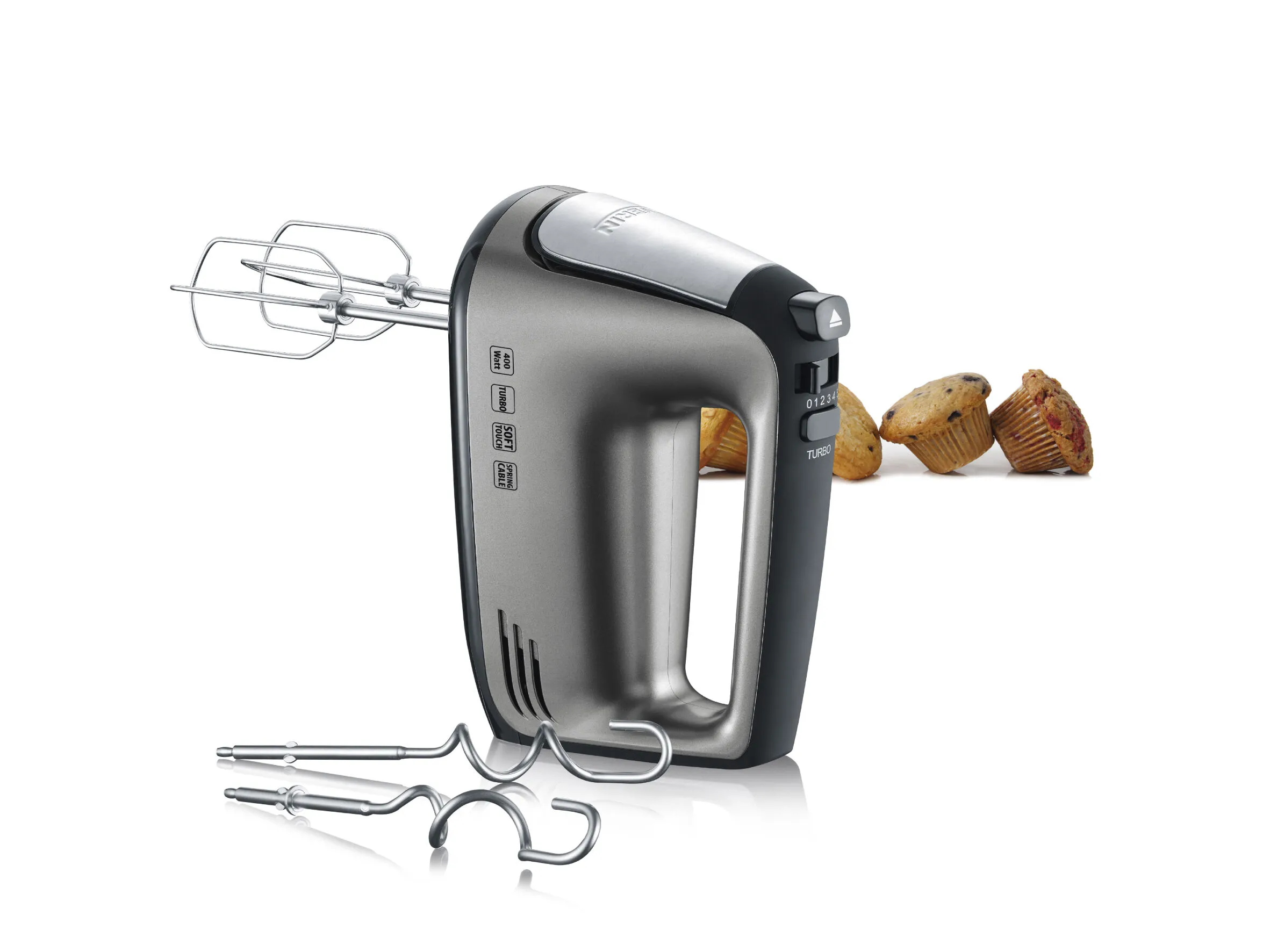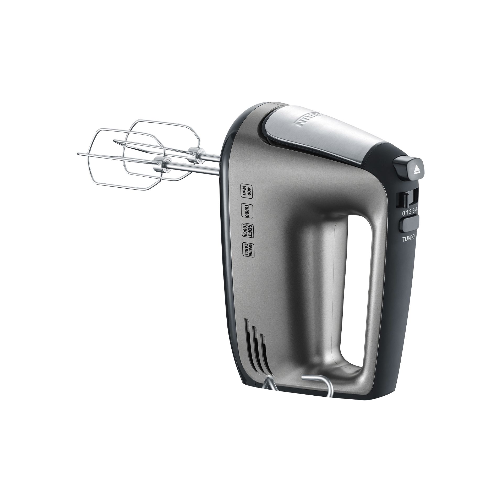 Håndmikser med kraftig 400 watt motor, fleksibel spiralledning, 5 hastigheder samt turboindstilling. Metallakeret kabinet i grå og sort med detaljer i rustfri stål, behageligt soft-touch håndtag. Inklusiv to piskeris og to dejkroge.