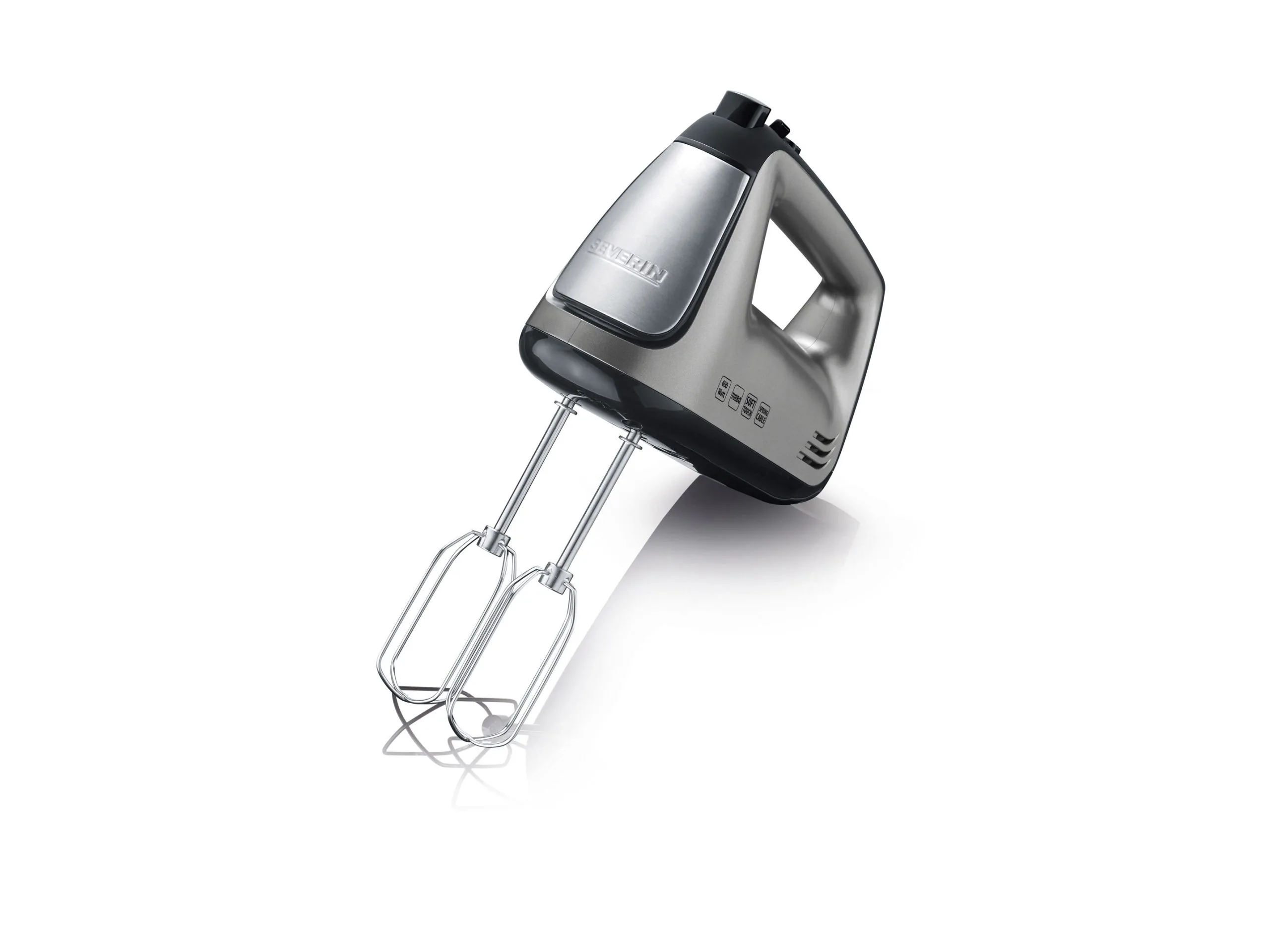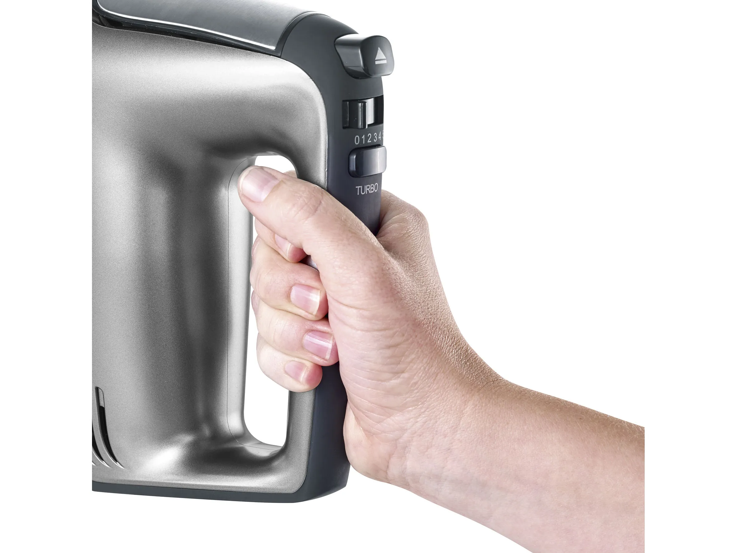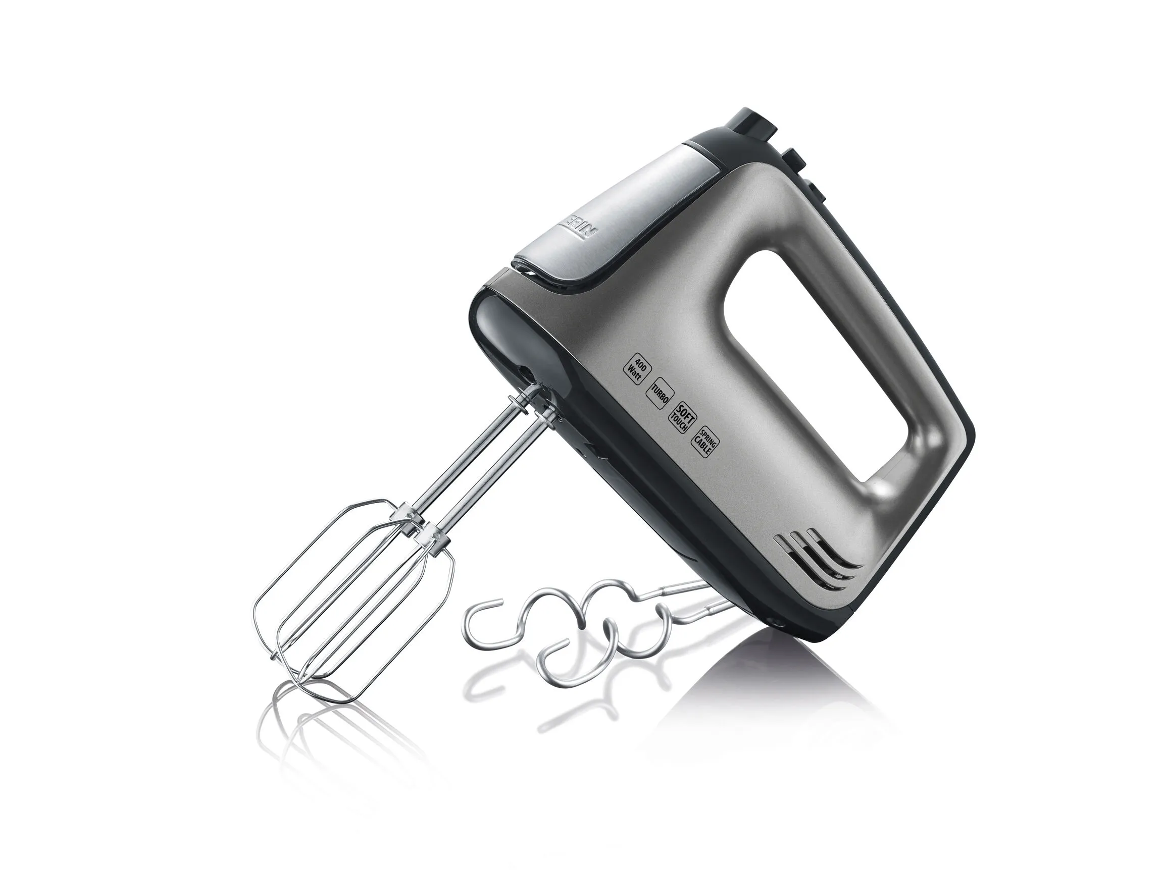 Håndmikser med kraftig 400 watt motor, fleksibel spiralledning, 5 hastigheder samt turboindstilling. Metallakeret kabinet i grå og sort med detaljer i rustfri stål, behageligt soft-touch håndtag. Inklusiv to piskeris og to dejkroge.