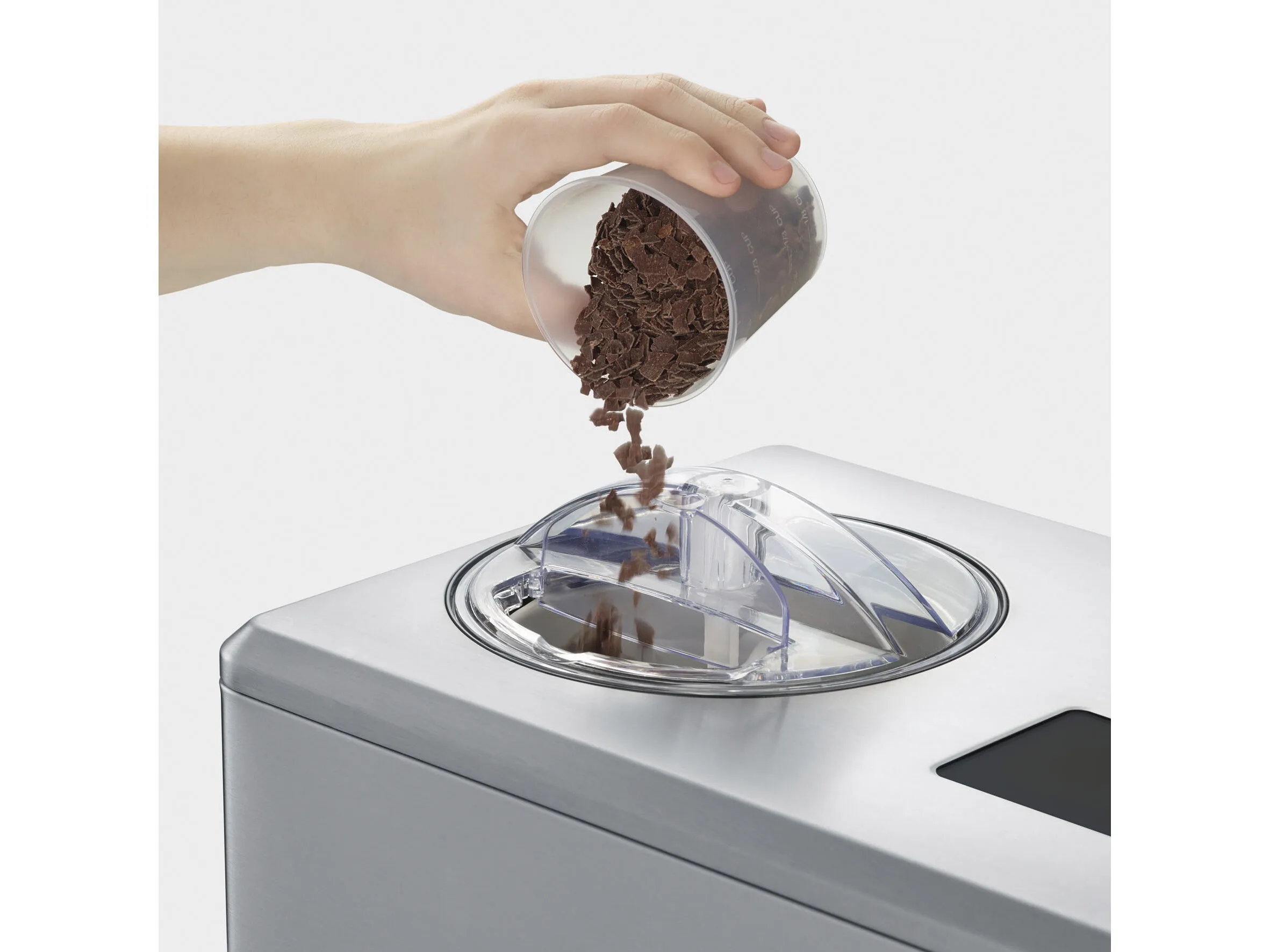 Ismaskinen har en praktisk åbning i låget, som gør det nemt at tilføje fx chokoladestykker til din is. Når isen er færdig, kan du aktivere en keep cool-funktion, som holder isen kold i op til 60 minutter. Ismaskinen har et brugervenligt LED touch display med temperaturvisning og en digital timer, der kan indstilles med intervaller på 1 minut.