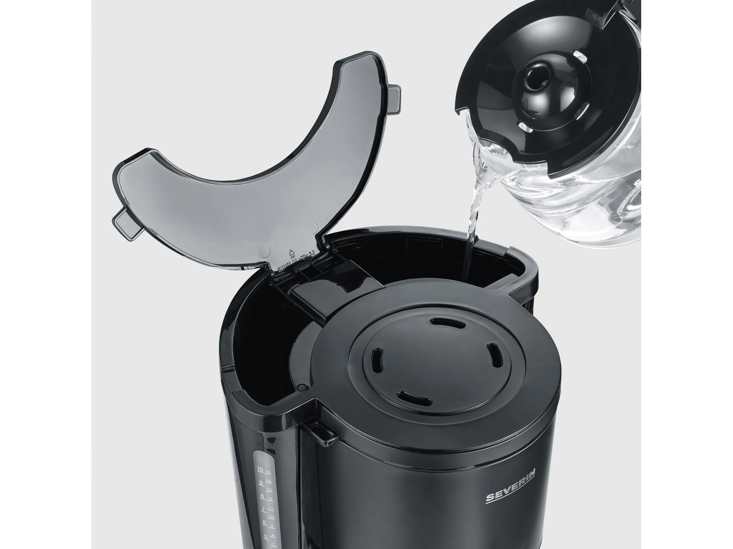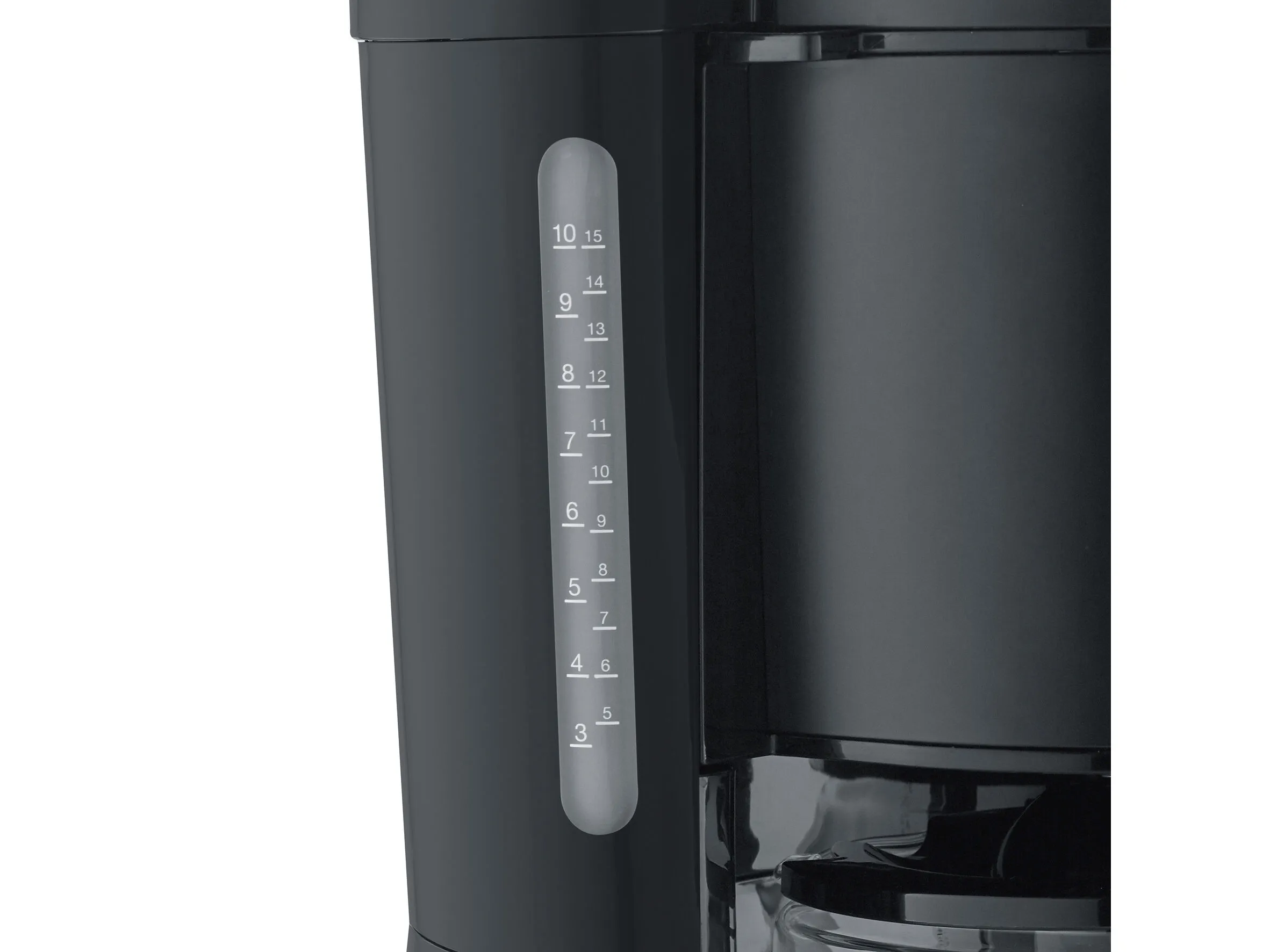 Kaffemaskinens filterbeholder kan nemt svinges ud og har en aftagelig filterindsats, der gør rengøring lettere. Glaskanden har kapacitet til 10 kopper svarende til cirka 1,25 liter og et ergonomisk håndtag. Sort mat.