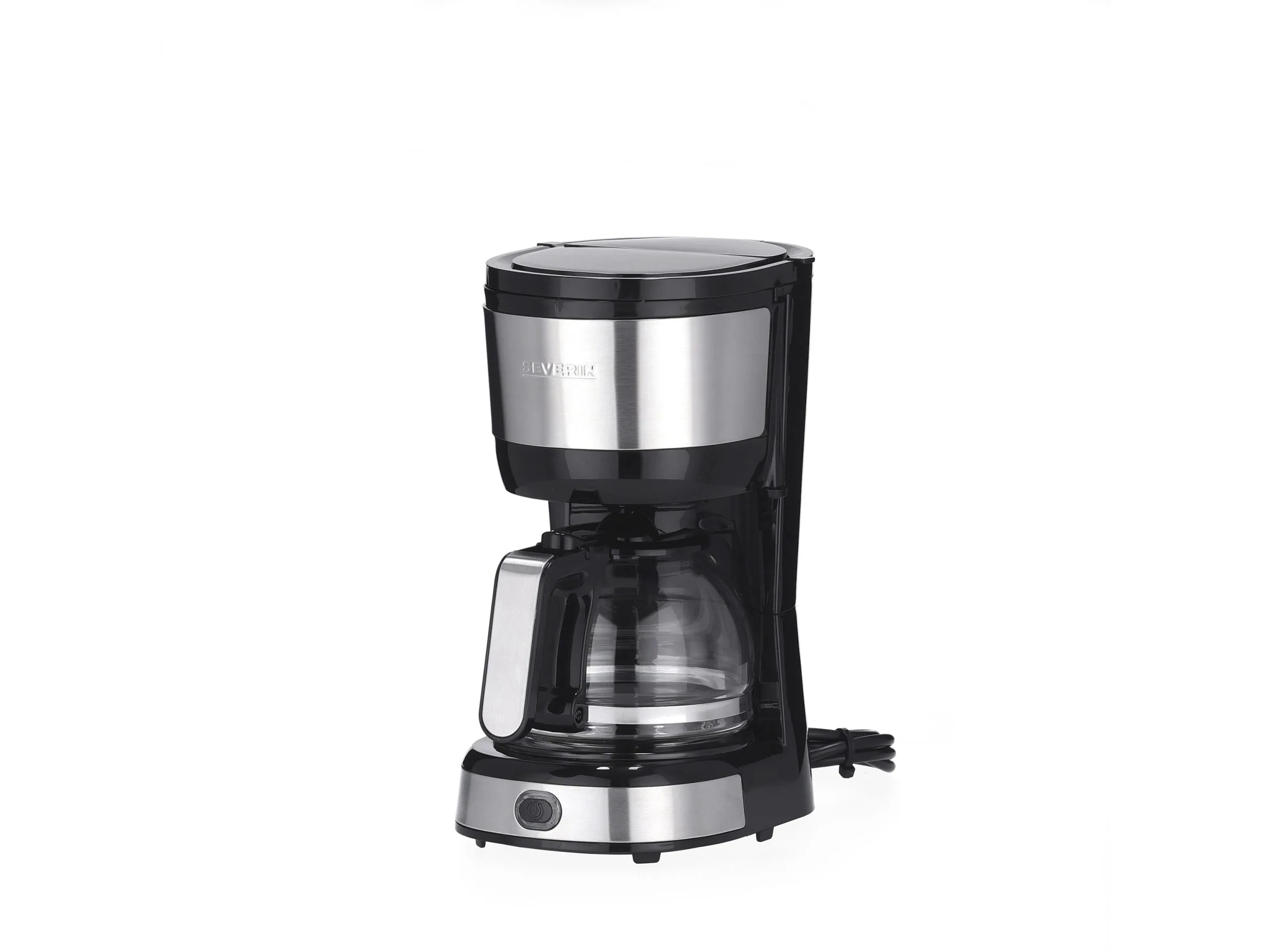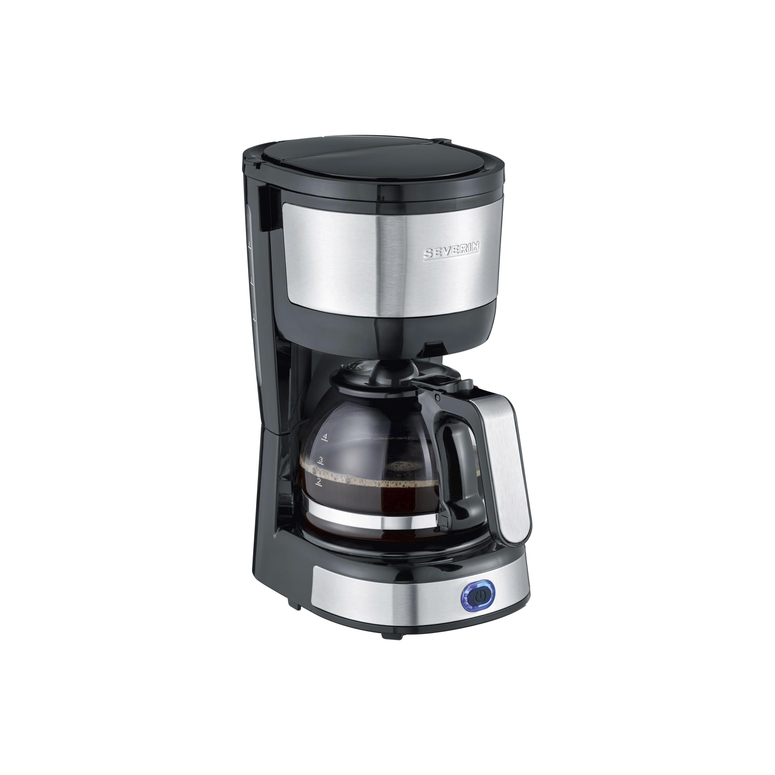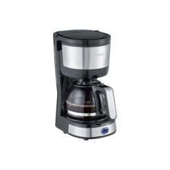 Her får du en mindre kaffemaskine, som er nem at betjene. Kaffemaskinens filterbeholder kan svinges ud til siden for nem påfyldning af kaffe og har en aftagelig filterindsats, der let kan rengøres. Glaskanden har kapacitet til ca. 4 kopper og et ergonomisk håndtag. Kaffemaskinen har tænd-/slukkontakt med kontrollys, automatisk slukning, drypstop og varmeplade med hold-varm-funktion. Kaffemaskinen fylder ikke meget og er derfor ideel til en bolig, hvor pladsen er trang, samt til dig, der ikke har brug for at lave store mængder kaffe. Den er fremstillet i børstet rustfrit stål og sort plast. 750 watt. Severin KA 4819.
