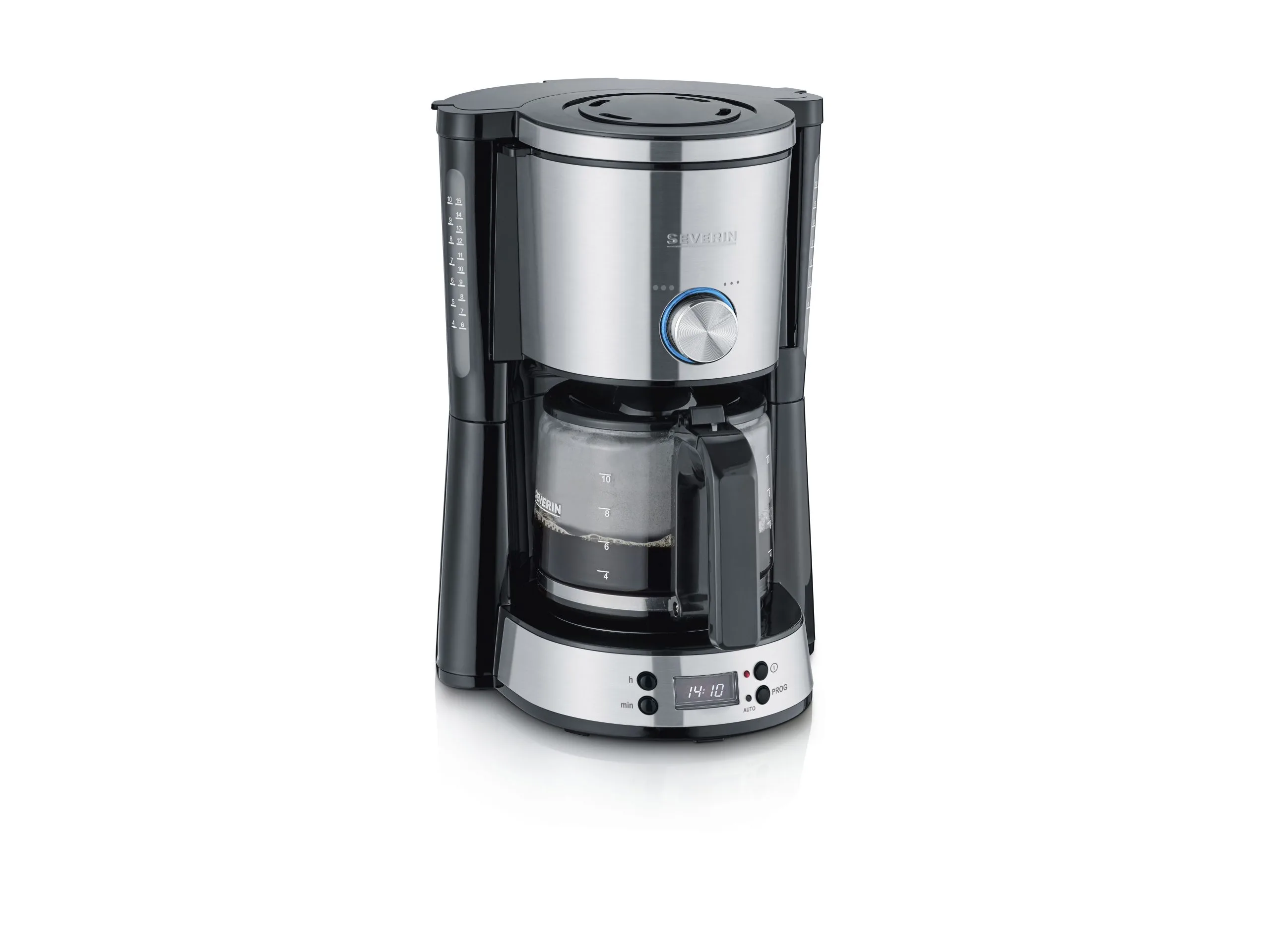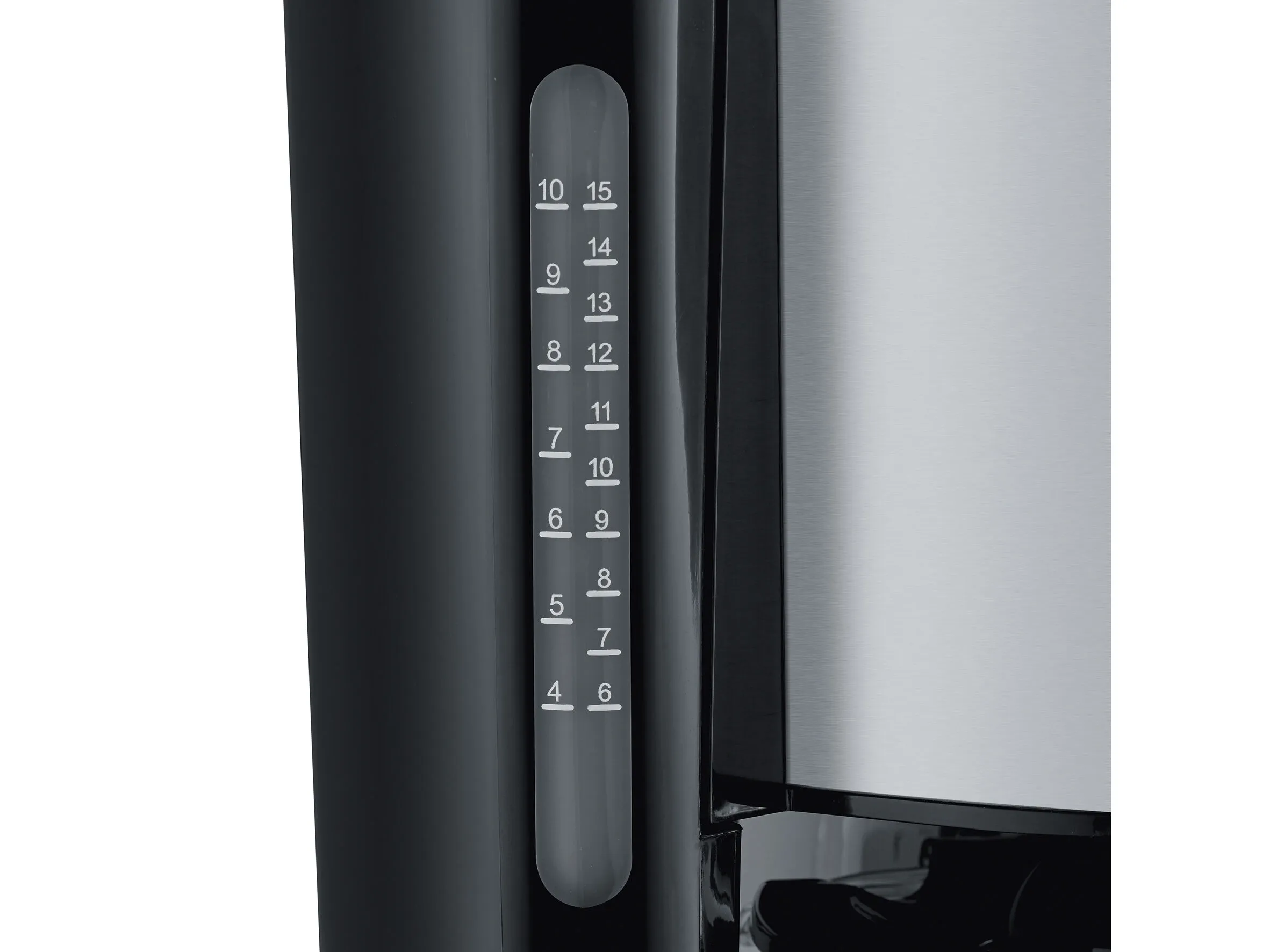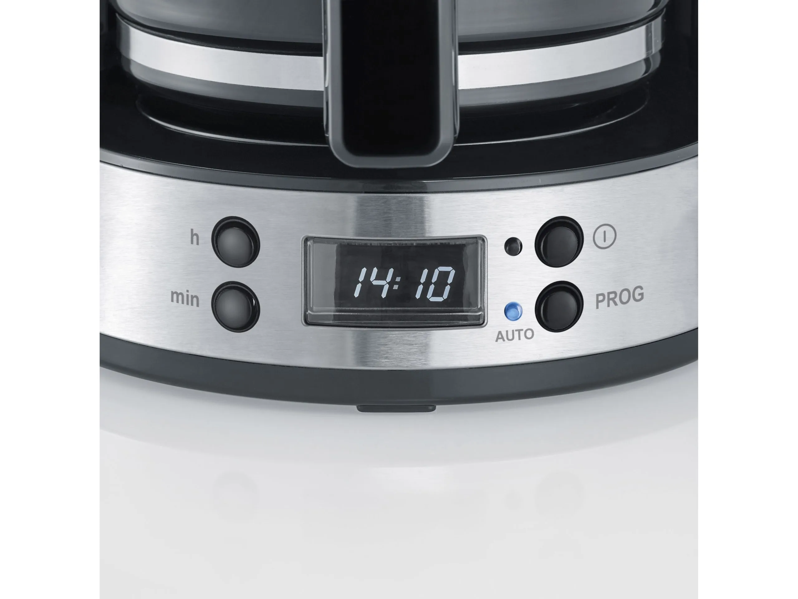 Kaffemaskinen har et digitalt ur med timer, så du nemt kan indstille maskinen til at starte kaffebrygningen. Den integrerede varmeplade med hold-varm-funktion sikrer, at du altid har varm kaffe på kanden. Maskinen slukker automatisk og har drypstop, vandstandsindikator og en glaskande med et ergonomisk håndtag. Kaffemaskinen har en svingbar tragt og aftagelig filterindsats, der gerne må rengøres i opvaskemaskinen samt et praktisk afkalkningssystem, der gør vedligeholdelsen lettere. Overflødig ledning kan du gemme væk i et integreret rum. Børstet stål/Sort.
