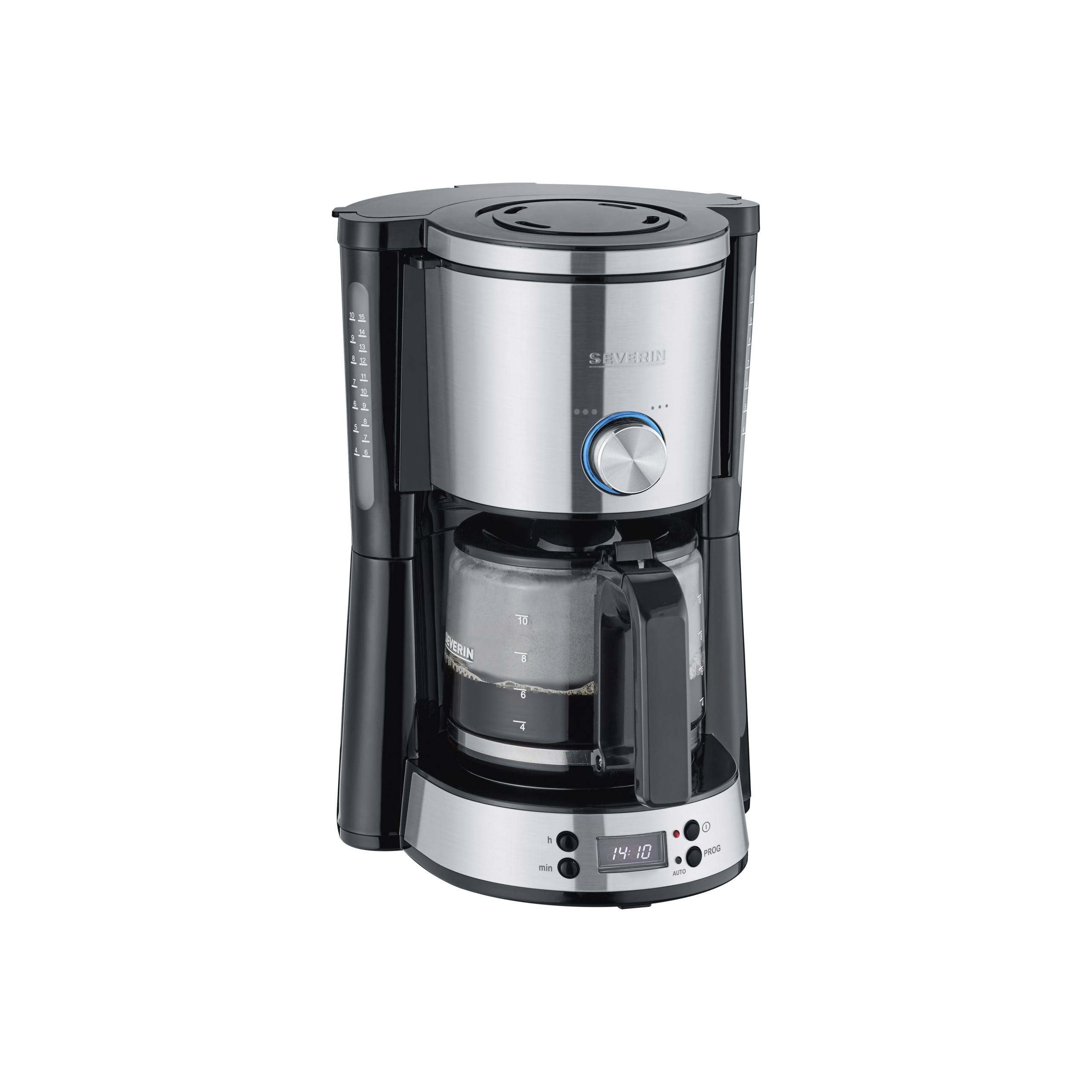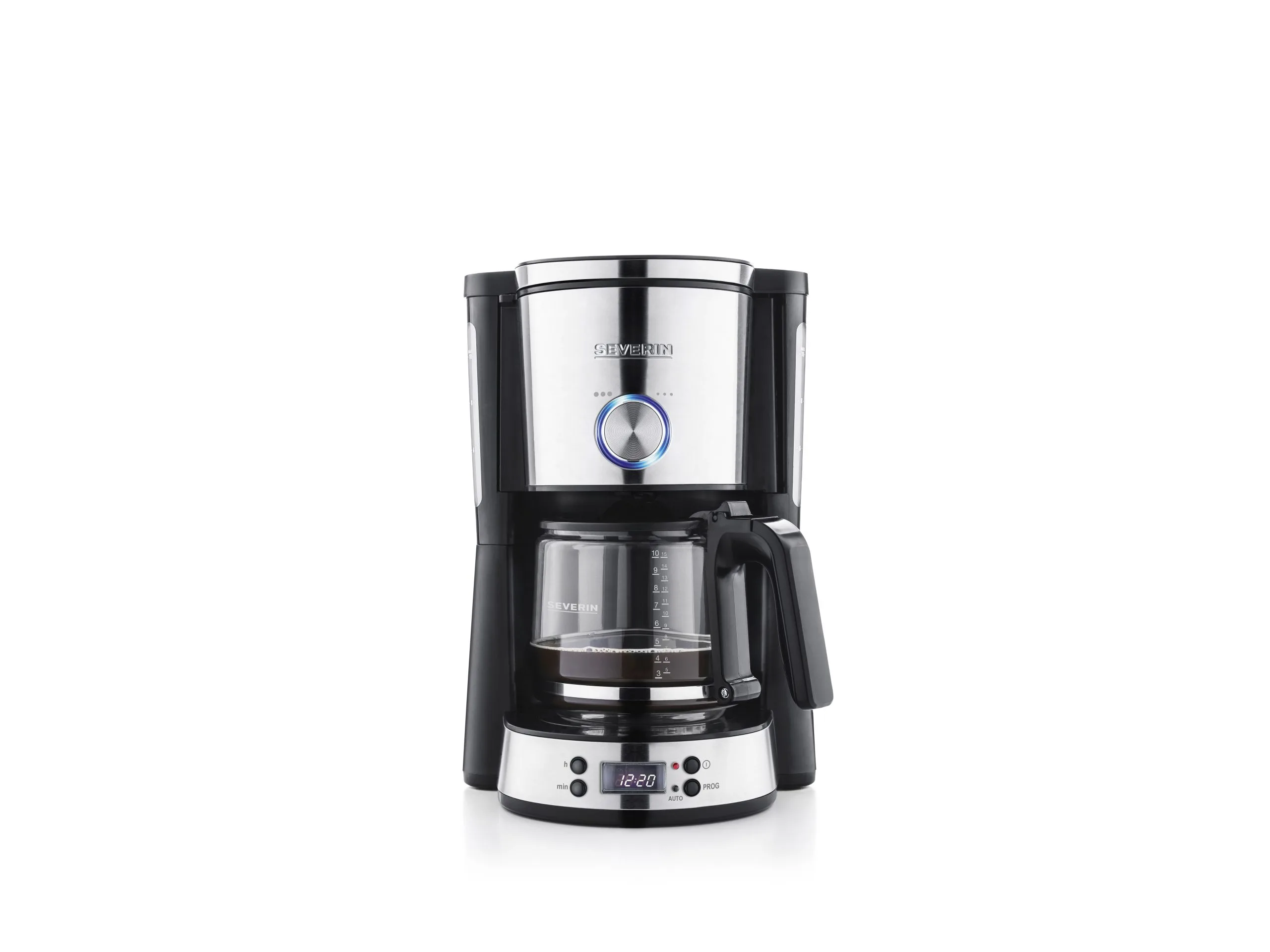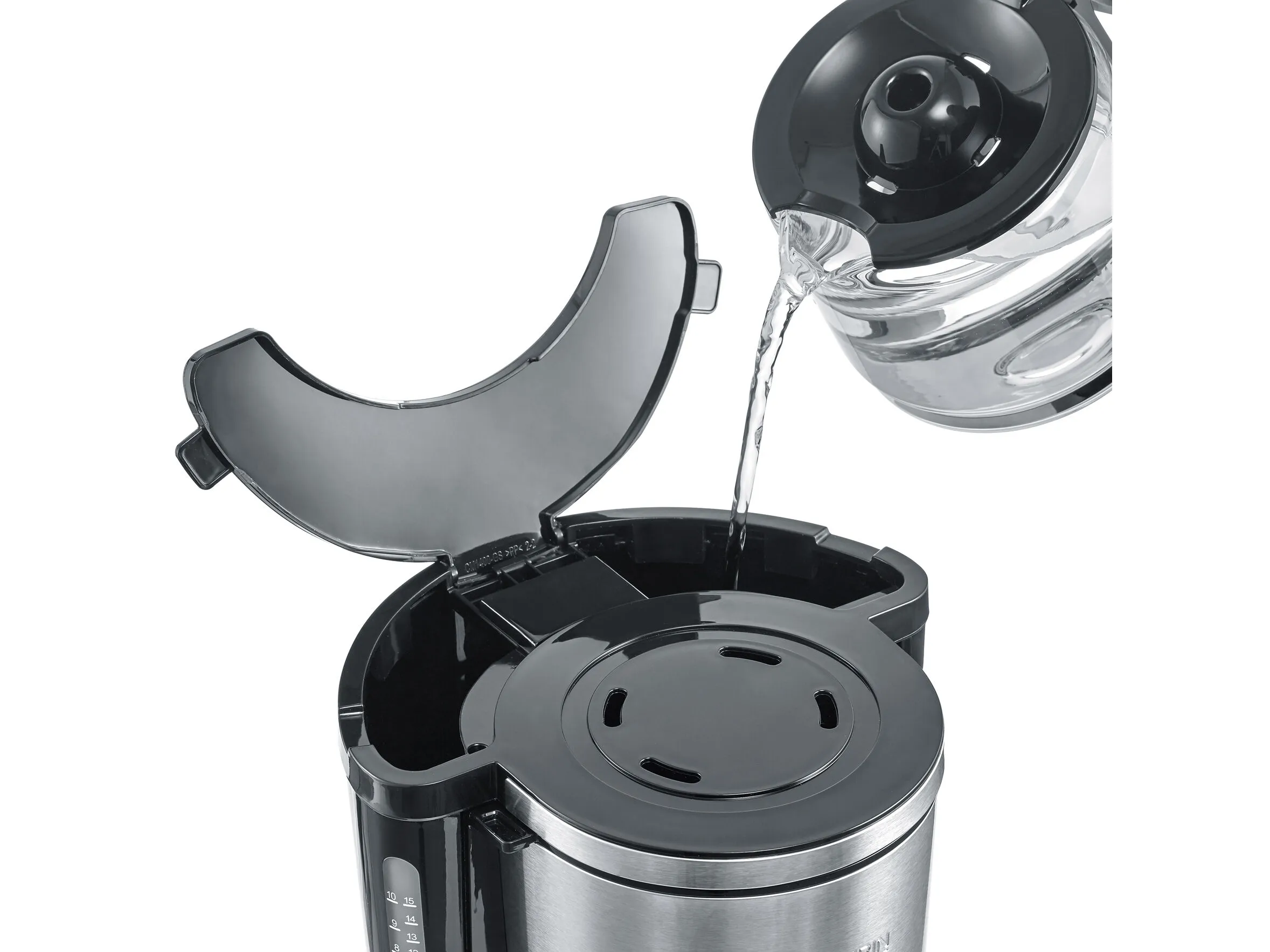 Kaffemaskinen har et digitalt ur med timer, så du nemt kan indstille maskinen til at starte kaffebrygningen. Den integrerede varmeplade med hold-varm-funktion sikrer, at du altid har varm kaffe på kanden. Maskinen slukker automatisk og har drypstop, vandstandsindikator og en glaskande med et ergonomisk håndtag. Kaffemaskinen har en svingbar tragt og aftagelig filterindsats, der gerne må rengøres i opvaskemaskinen samt et praktisk afkalkningssystem, der gør vedligeholdelsen lettere. Overflødig ledning kan du gemme væk i et integreret rum. Børstet stål/Sort.