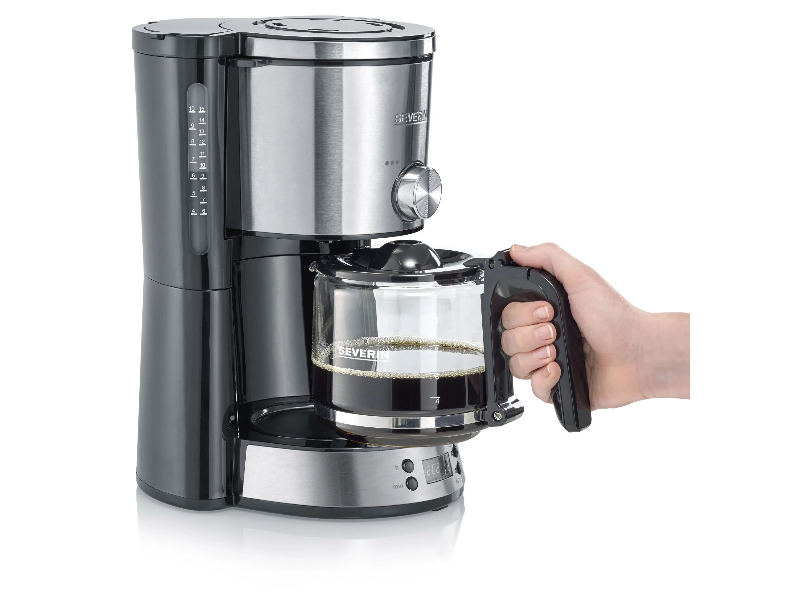 Severin KA 4826 kaffemaskine brygger effektivt op til 10 kopper kaffe. Med AromaSwitch kan du vælge mellem bryggeprofilerne normal eller mild og få den kaffestyrke, som du bedst kan lide til morgen- eller eftermiddagskaffen. 1000 W.