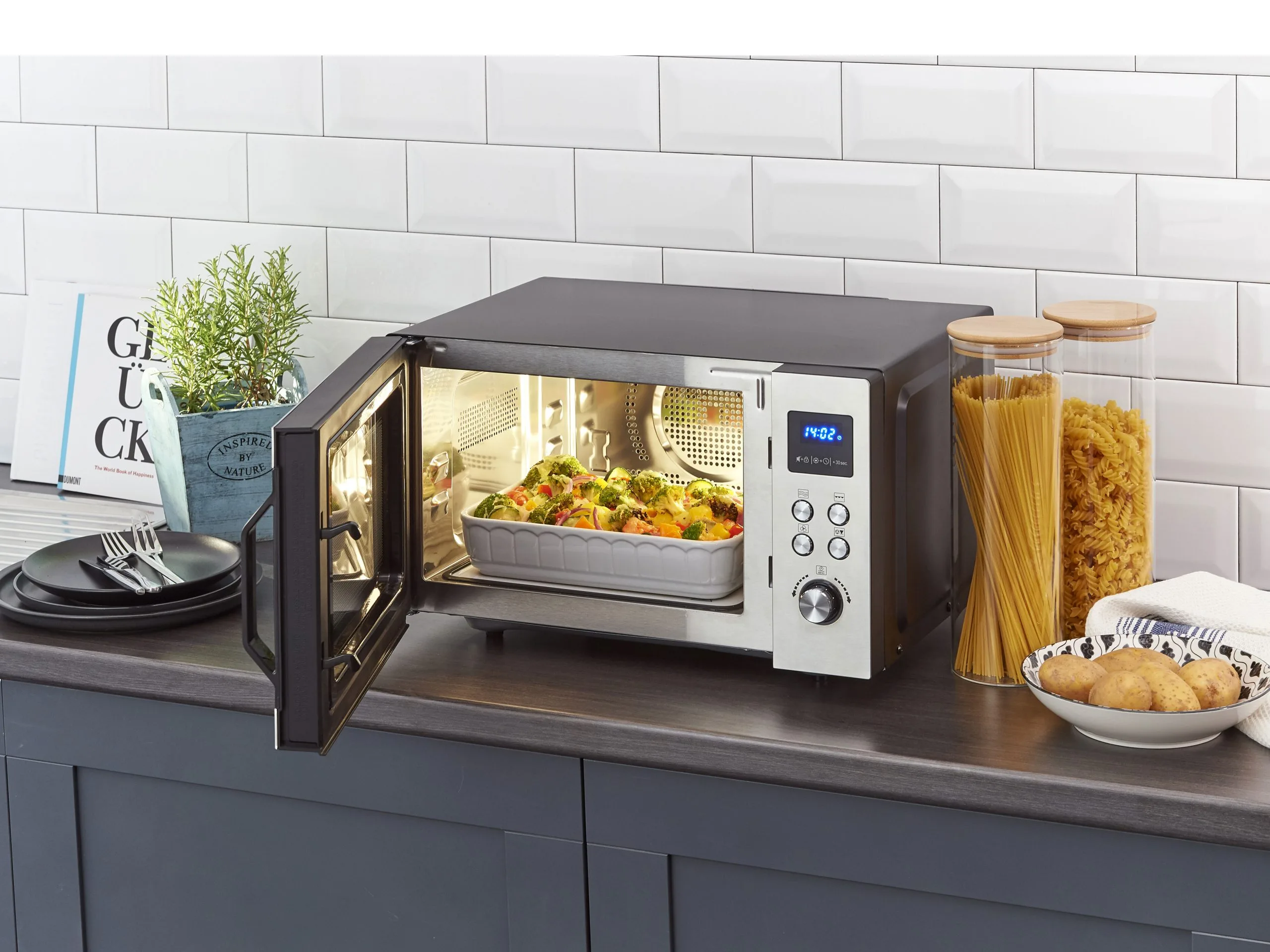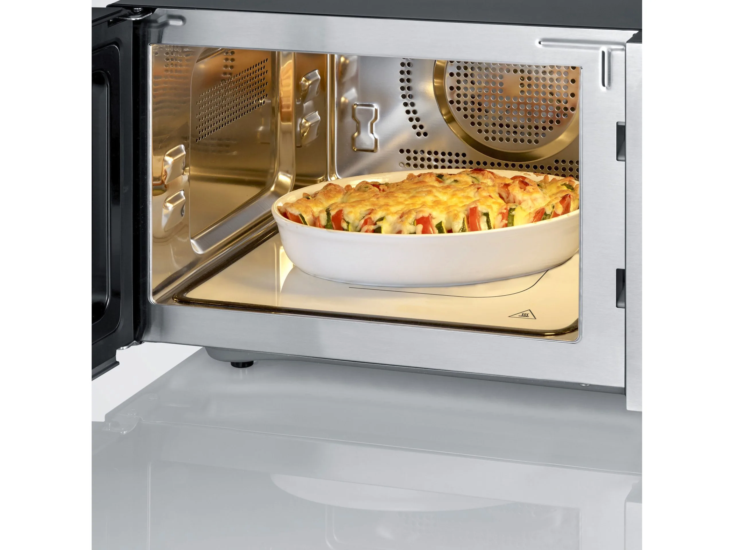 Tilberedning på to niveauer ved at bruge den udtagelige grillplade. Temperaturindstilling på varmluft op til 230 °C. Ledning på 1 meter samt børnelås. Effekt på mikrobølgeovn 900 watt, effekt på grill 1200 watt og effekt på varmluftfunktion 2050 watt. Vægt 17,4 kg.