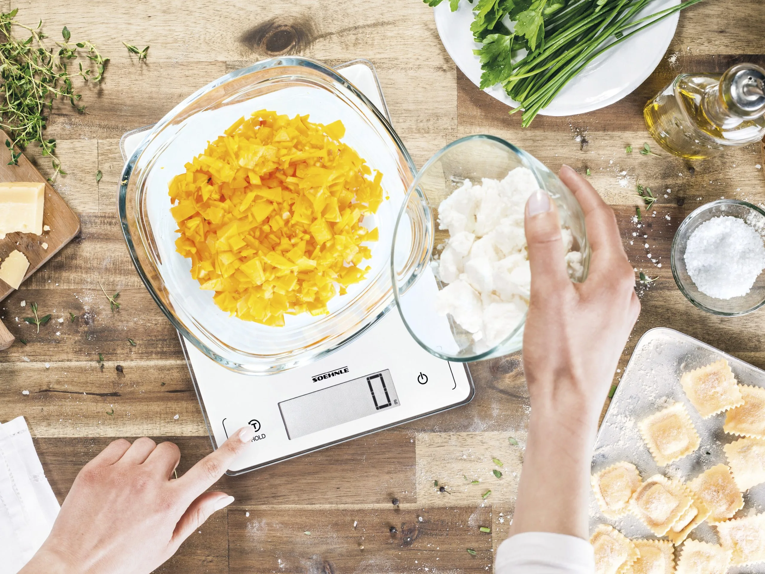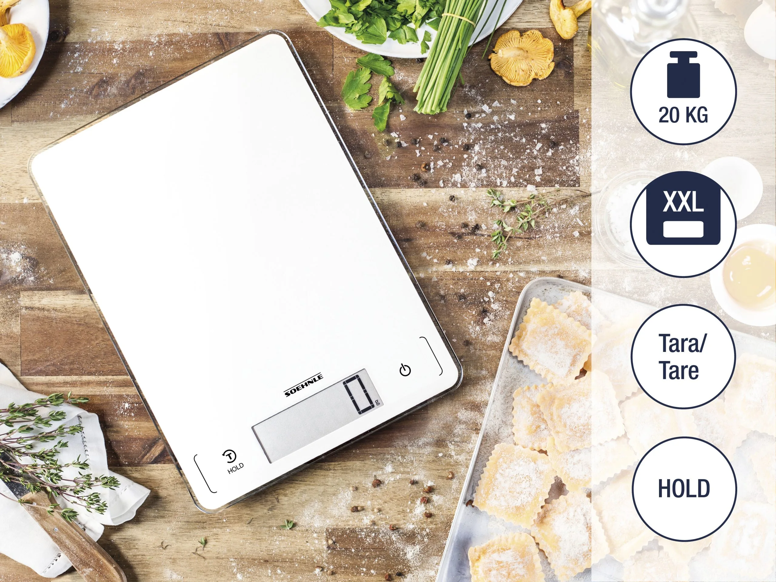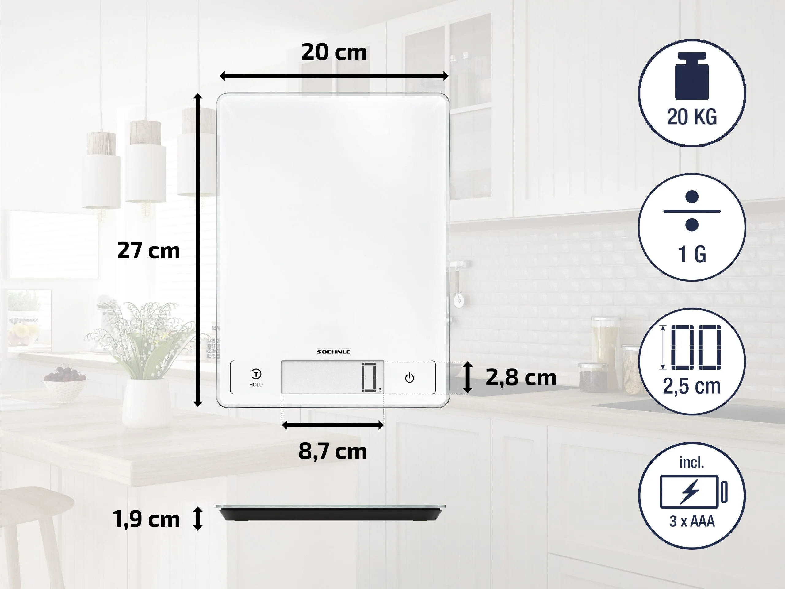 Køkkenvægt i kompakt og ekstra tyndt design og ekstra stor overflade, 27 x 20 x 1,9 cm. Vejer op til 20 kg med interval på 1 g, hvilket gør den ideel til fx krydderier. Letlæseligt display, tarafunktion og energisparende autosluk-funktion. Enhederne vises i g/kg eller oz/lb.